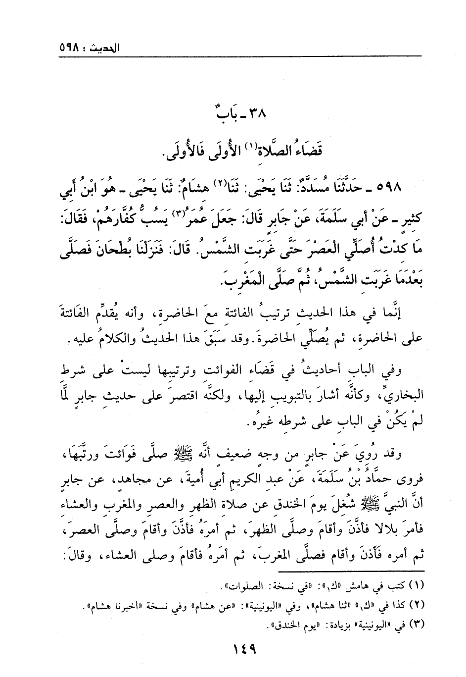 598 - حدثنا مسدد: ثنا يحيى: ثنا هشام: ثنا يحيى - هو: ابن أبي كثير -، عن أبي سلمة، عن جابر، قال: جعل عمر [يوم الخندق] يسب كفارهم، فقال: ما كدت أصلي العصر حتى غربت الشمس. قال: فنزلنا بطحان، فصلى بعدما غربت الشمس، ثم صلى المغرب.