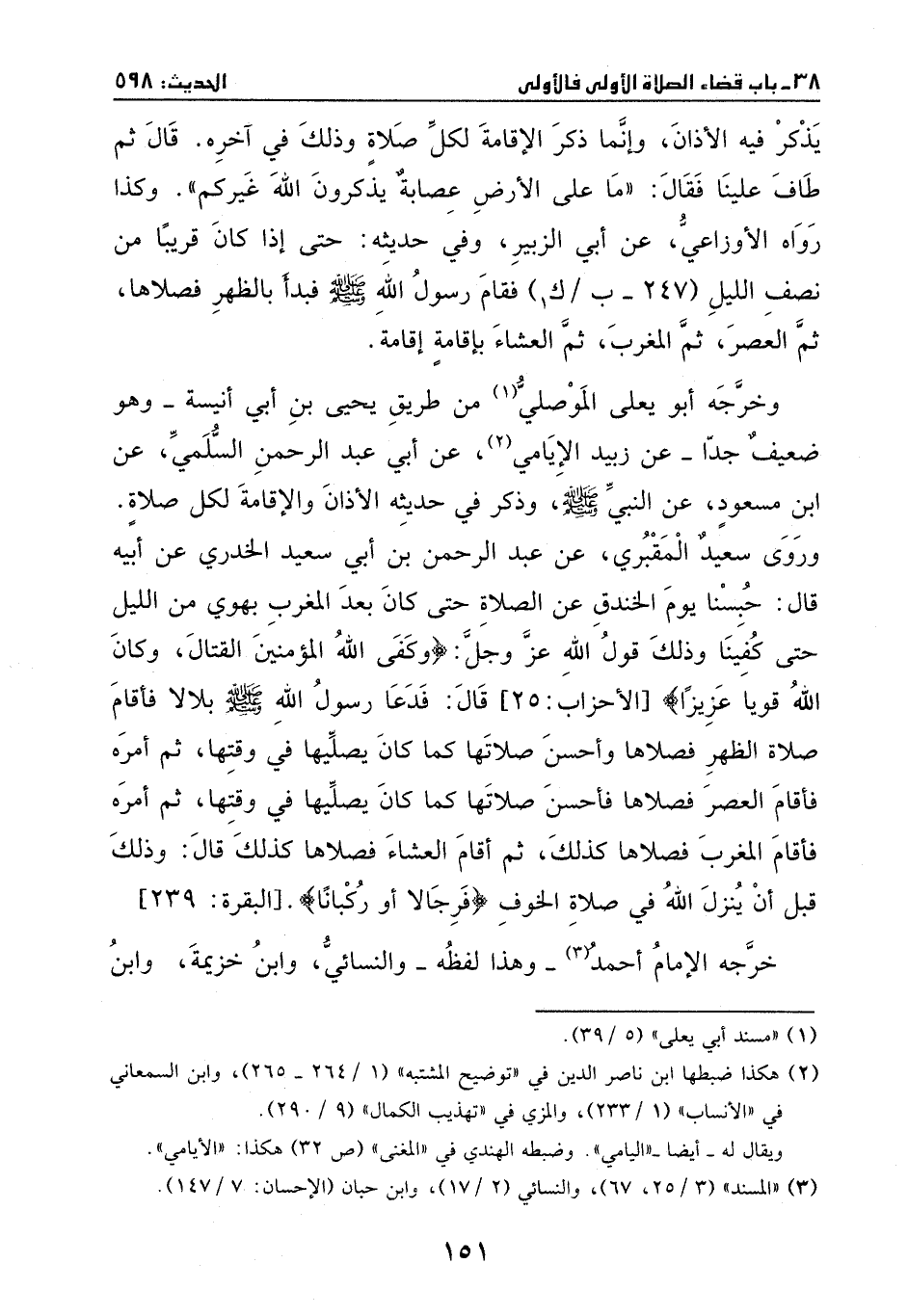 وروى سعيد المقبري، عن عبد الرحمن بن أبي سعيد الخدري، عن أبيه، قال: حبسنا يوم الخندق عن الصلاة، حتى كان بعد المغرب بهوي من الليل، حتى كفينا، وذلك قول الله عز وجل: {وكفى الله ... . عزيزاً} [الأحزاب: 25] . قال: فدعا رسول الله - صَلَّى اللهُ عَلَيْهِ وَسَلَّمَ - بلالاً، فاقام صلاة الظهر، فصلاها وأحسن صلاتها، كما كان يصليها في وقتها، ثم أمره فأقام العصر، فصلاها فأحسن صلاتها كما كان يصليها في وقتها، ثم أمره فأقام المغرب، فصلاها كذلك، ثم أقام العشاء، فصلاها كذلك. قال: وذلك قبل أن ينزل الله في صلاة الخوف: {فرجالاً أو ركباناً} [البقرة: 239] .