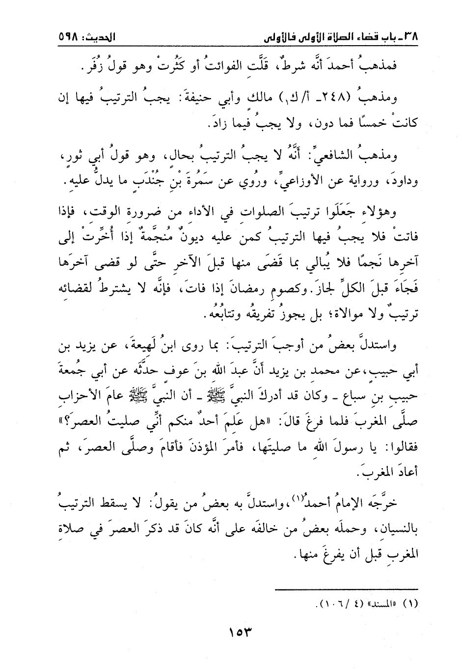 واستدل بعض من أوجب الترتيب بما روى ابن لهيعة، عن يزيد بن أبي حبيب، عن محمد بن يزيد، أن عبد الله بن عوف حدثه، عن أبي جمعة حبيب بن سباع – وكان قد أدرك النبي - صَلَّى اللهُ عَلَيْهِ وَسَلَّمَ -، أن النبي - صَلَّى اللهُ عَلَيْهِ وَسَلَّمَ - عام الأحزاب صلى المغرب، فلما فرغ قال: (هل علم أحد منكم أني صليت العصر؟) فقالوا: يا رسول الله، ما صليتها، فأمر المؤذن فأقام، وصلى العصر، ثم أعاد المغرب.
