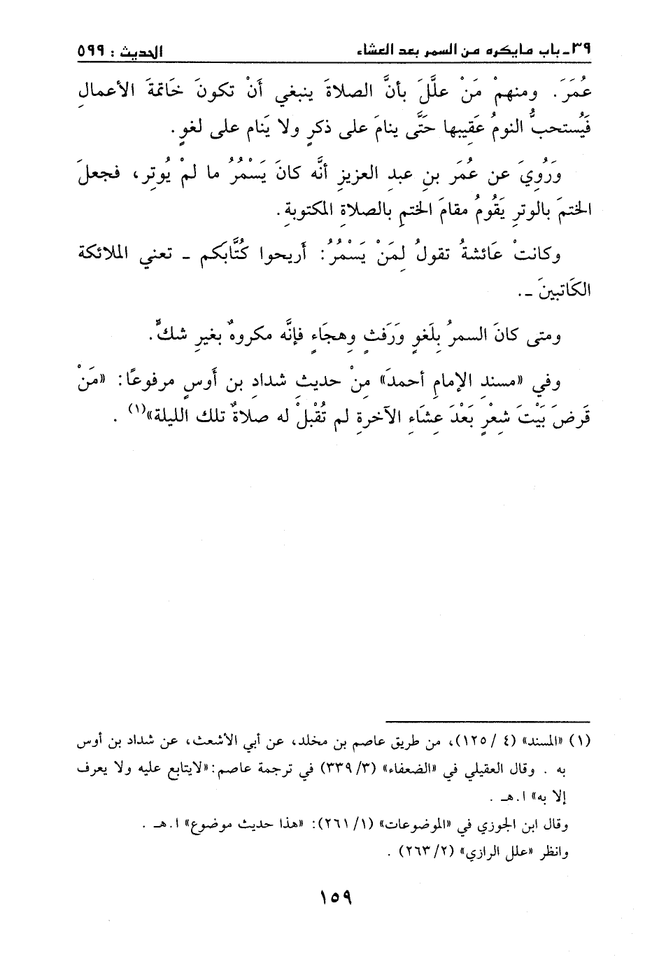 وفي (مسند الإمام أحمد) من حديث شداد بن أوس – مرفوعاً -: (من قرض بيت شعر بعد عشاء الآخرة لم يقبل له صلاة تلك الليلة) .