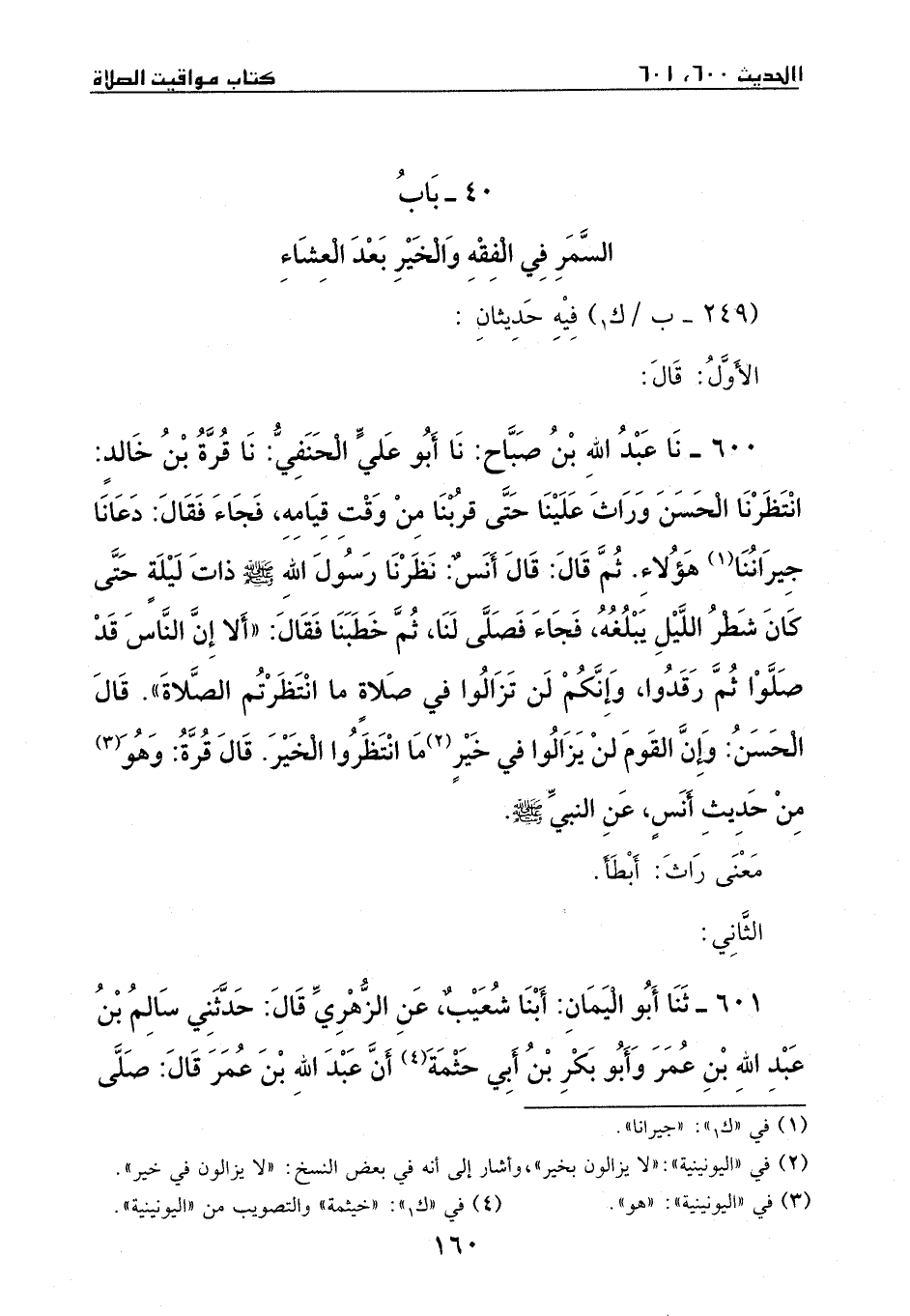 600 - نا عبد الله بن صباح: نا أبو علي الحنفي: نا قرة بن خالد: أنتظرنا الحسن وراث علينا حتى قربنا من وقت قيامه، فجاء، قال: دعانا جيراننا هؤلاء، ثم قال: قال أنس: نظرنا رسول الله - صَلَّى اللهُ عَلَيْهِ وَسَلَّمَ - ذات ليلة، حتى كان شطر الليل يبلغه، فجاء فصلى لنا، ثم خطبنا، فقال: (ألا إن الناس قد صلوا، ثم رقدوا، وإنكم لن تزالوا في صلاة ما انتظرتم الصلاة) .
