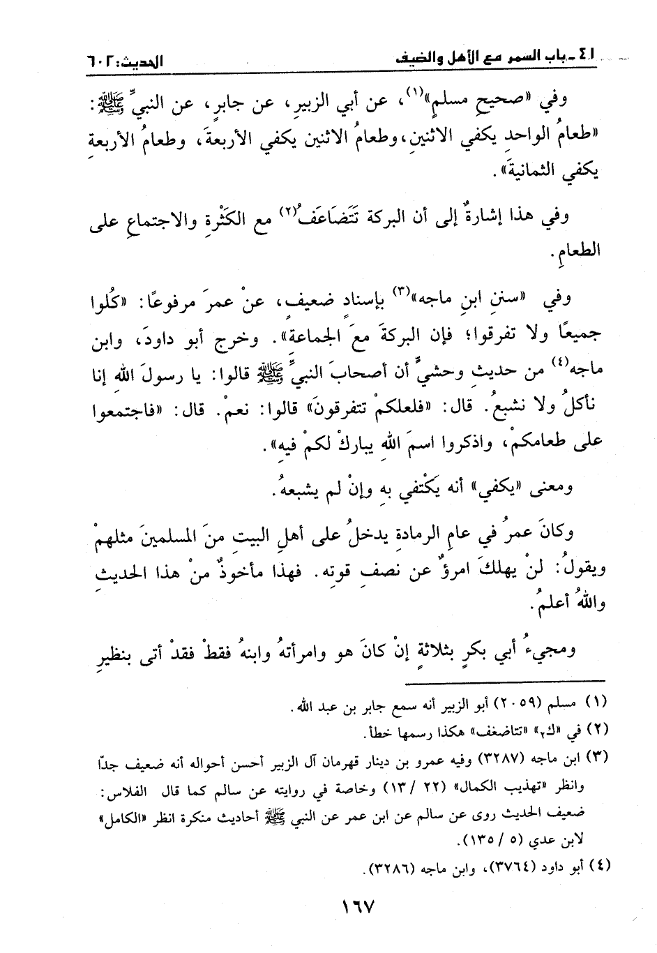 وفي (صحيح مسلم) ، عن أبي الزبير، عن جابر، عن النبي - صَلَّى اللهُ عَلَيْهِ وَسَلَّمَ -: (طعام الواحد يكفي الاثنين، وطعام الاثنين يكفي الأربعة، وطعام الأربعة يكفي الثمانية) .