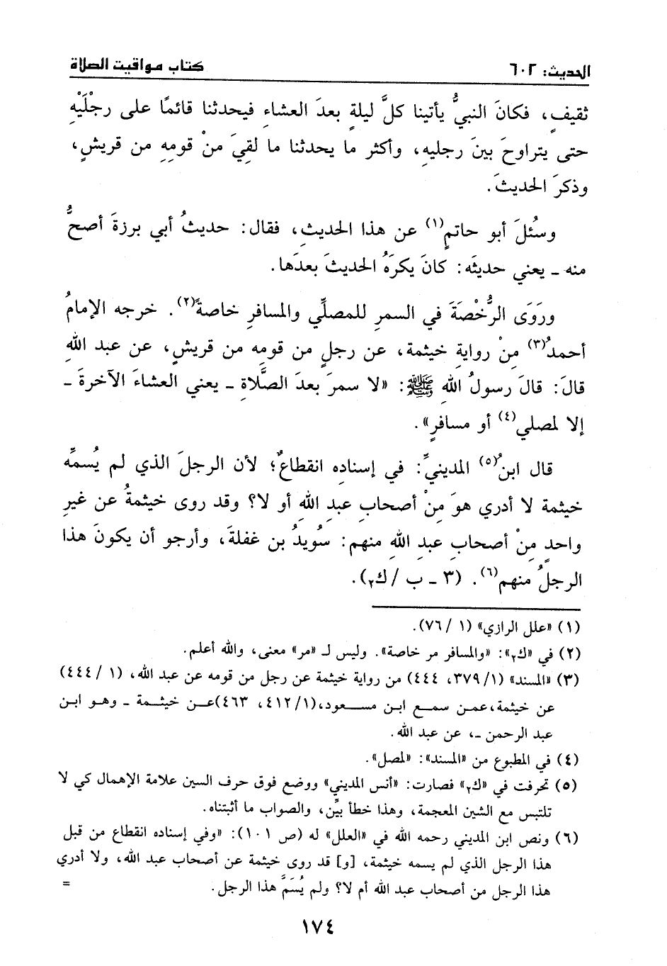 خرجه الإمام أحمد من رواية خيثمة، عن رجل من قومه من قريش، عن عبد الله، قال: قال رسول الله - صَلَّى اللهُ عَلَيْهِ وَسَلَّمَ -: (لا سمر بعد الصلاة) – يعني: العشاء الآخرة - (إلا لمصل أو مسافر) .