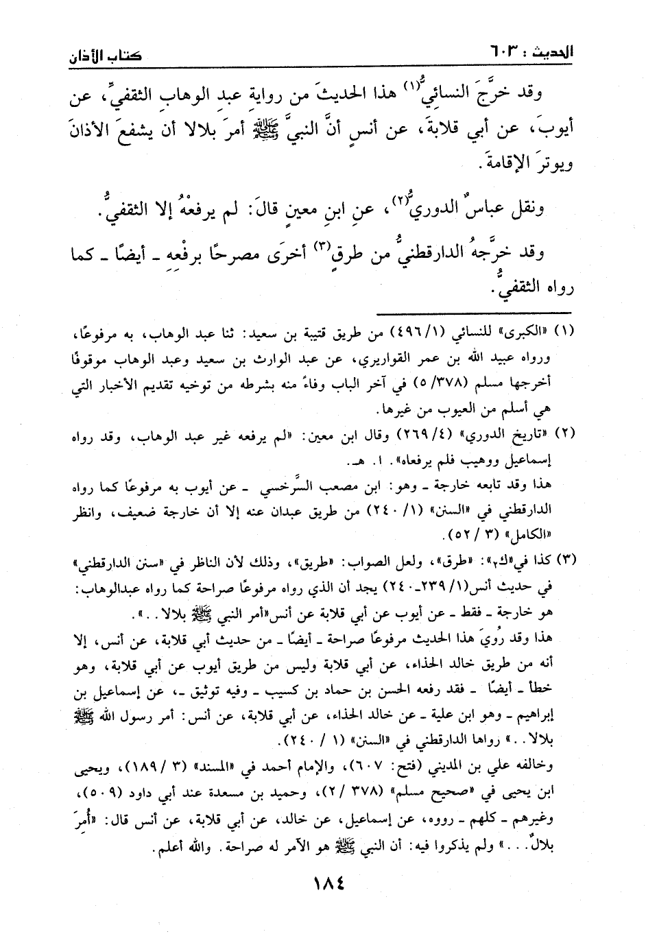 وقد خرج النسائي هذا الحديث من رواية عبد الوهاب الثقفي، عن أيوب، عن أبي قلابة، عن أنس، أن النبي - صَلَّى اللهُ عَلَيْهِ وَسَلَّمَ - أمر بلالاً أن يشفع الأذان ويوتر الإقامة.