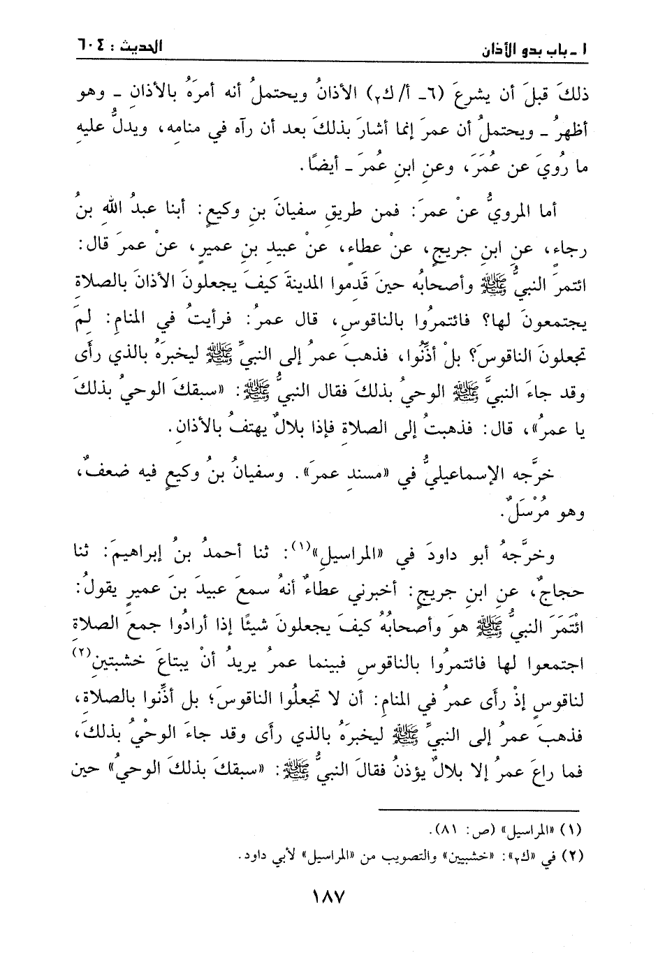وخرجه ابو داود في " المراسيل": ثنا أحمد بن إبراهيم: ثنا حجاج، عن ابن جريج: أخبرني عطاء، أنه سمع عبيد بن عمير يقول: ائتمر النبي - صَلَّى اللهُ عَلَيْهِ وَسَلَّمَ - هو وأصحابه، كيف يجعلون شيئاً إذا أرادوا جمع الصلاة اجتمعوا لها [به] ، فائتمروا بالناقوس، فبينما عمر يريد أن يبتاع خشبتين لناقوس إذ رأى عمر في المنام أن لا تجعلوا الناقوس، بل أذنوا بالصلاة، فذهب عمر إلى النبي - صَلَّى اللهُ عَلَيْهِ وَسَلَّمَ - ليخبره بالذي رأى، وقد جاء الوحي بذلك، فما راع عمر إلا بلال يؤذن، فقال النبي - صَلَّى اللهُ عَلَيْهِ وَسَلَّمَ -: " سبقك بذلك الوحي"، حين