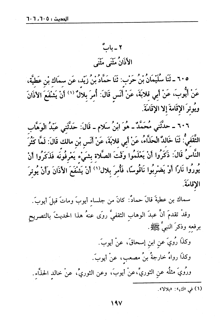 606 - حدثني محمد - هو: ابن سلام -، قال: حدثني عبد الوهاب الثقفي: ثنا خالد الحذاء، عن أبي قلابة، عن أنس بن مالك، قال: لما كثر الناس، قال: ذكروا أن يعلموا وقت الصلاة بشيء يعرفونه، فذكروا أن يوروا ناراً، أو يضربوا ناقوساً، فأمر بلال ان يشفع الأذان، وأن يوتر الإقامة.