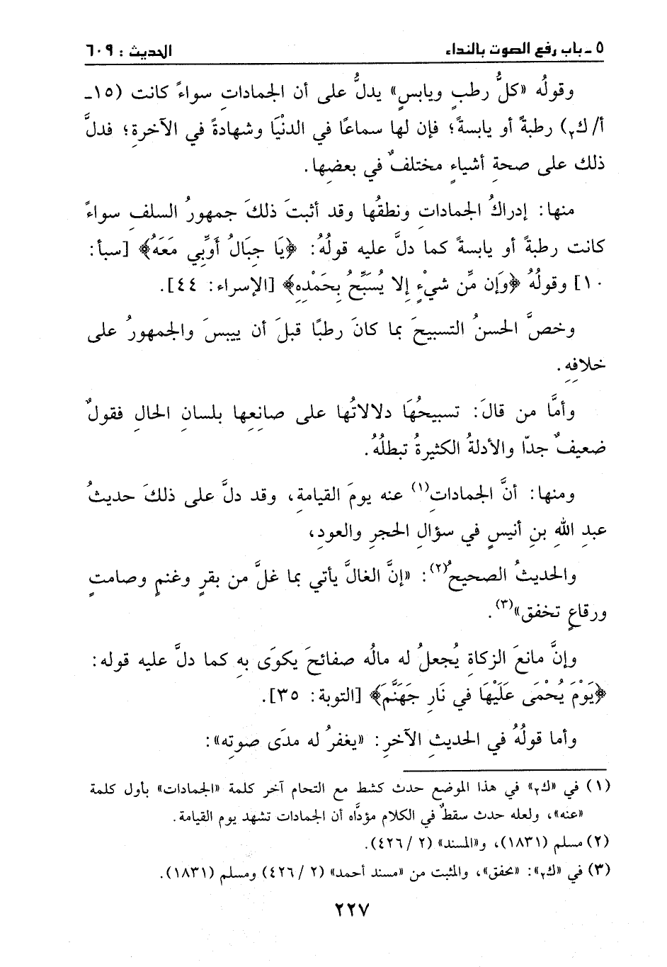 وقد أثبت ذلك جمهور السلف، سواء كانت رطبة أو يابسة، كما دل عليه قوله: {يَاجِبَالُ أَوِّبِي مَعَهُ} [سبأ: 10] ، وقوله: {وَإِنْ مِنْ شَيْءٍ إِلا يُسَبِّحُ بِحَمْدِهِ} ? [الإسراء: 44] .