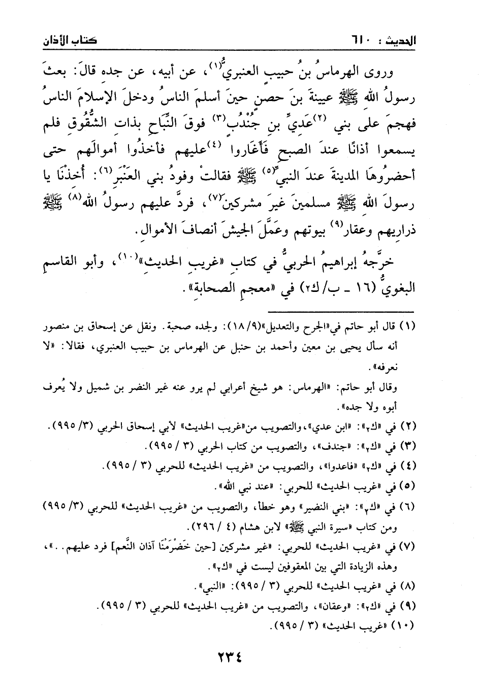 وروى الهرماس بن حبيب العنبري، عن أبيه، عن جده، قال: بعث رسول الله - صَلَّى اللهُ عَلَيْهِ وَسَلَّمَ - عيينة بن حصن حين أسلم الناس ودجا الإسلام على الناس، فهجم على بني عدي بن جندب فوق النباح بذات الشقوق، فلم يسمعوا أذانا عند الصبح، فأغاروا عليهم، فأخذوا أموالهم حتى أحضروها المدينة عند النبي - صَلَّى اللهُ عَلَيْهِ وَسَلَّمَ -، فقالت وفود بني العنبر: أخذنا يا رسول الله مسلمين غير مشركين. فرد عليهم رسول الله - صَلَّى اللهُ عَلَيْهِ وَسَلَّمَ - ذراريهم وعقار بيوتهم، وعمل الجيش أنصاف الأموال.