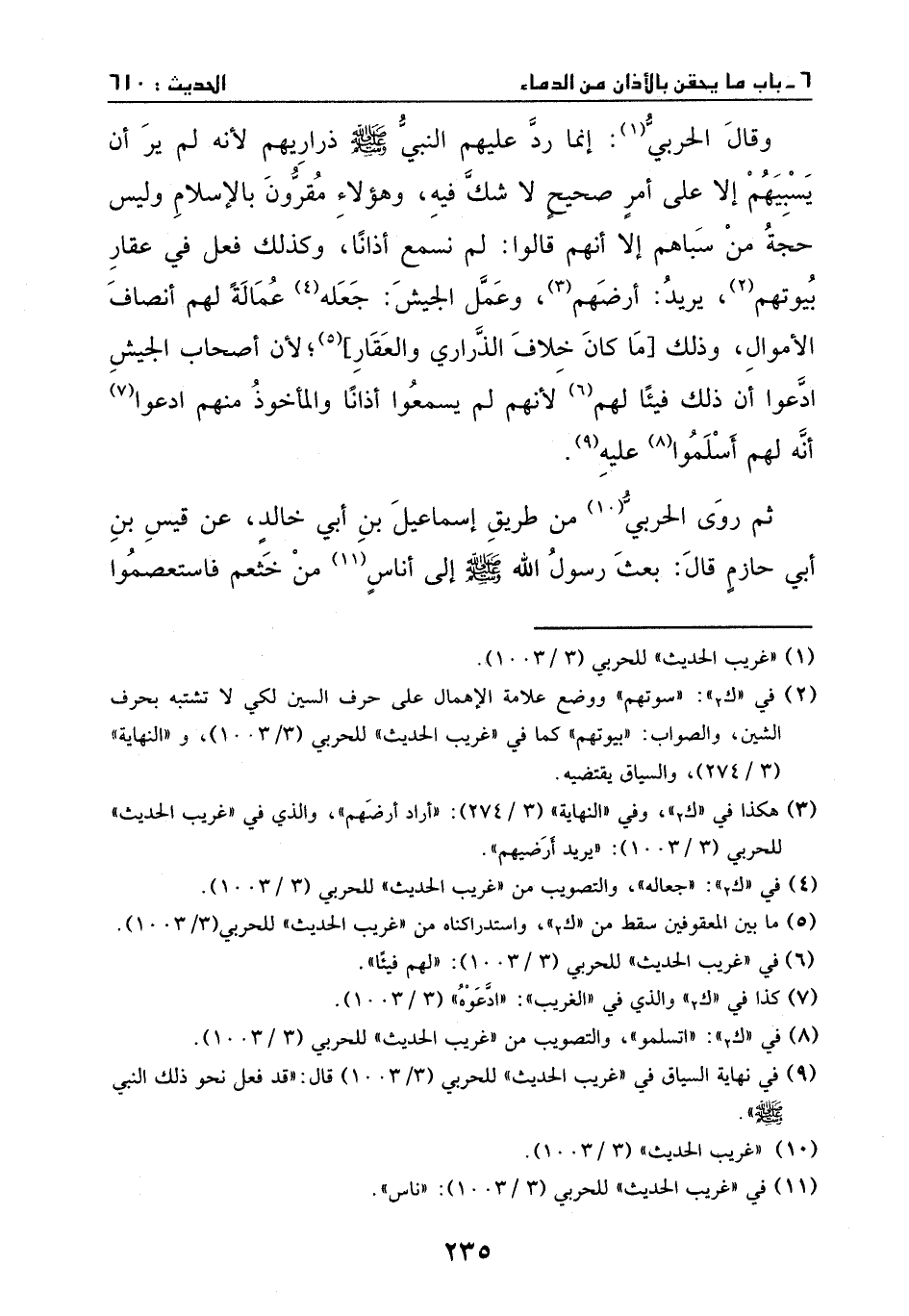 وقال الحربي: إنما رد عليهم النبي - صَلَّى اللهُ عَلَيْهِ وَسَلَّمَ - ذراريهم؛ لأنه لم ير أن يسبيهم إلا على أمر صحيح لا شك فيه، وهؤلاء مقرون بالإسلام، وليس حجة من سباهم، إلا أنهم قالوا: لم نسمع أذاناً. وكذلك فعل في عقار بيوتهم - يريد: أرضهم -، وعمل الجيش جعالة عمالة لهم أنصاف الأموال؛ وذلك لأن أصحاب الجيش ادعوا أن ذلك فيئاً لهم؛ لأنهم لم يسمعوا أذاناً، والمأخوذ منهم ادعوا أنه لهم؛ أسلموا عليه.