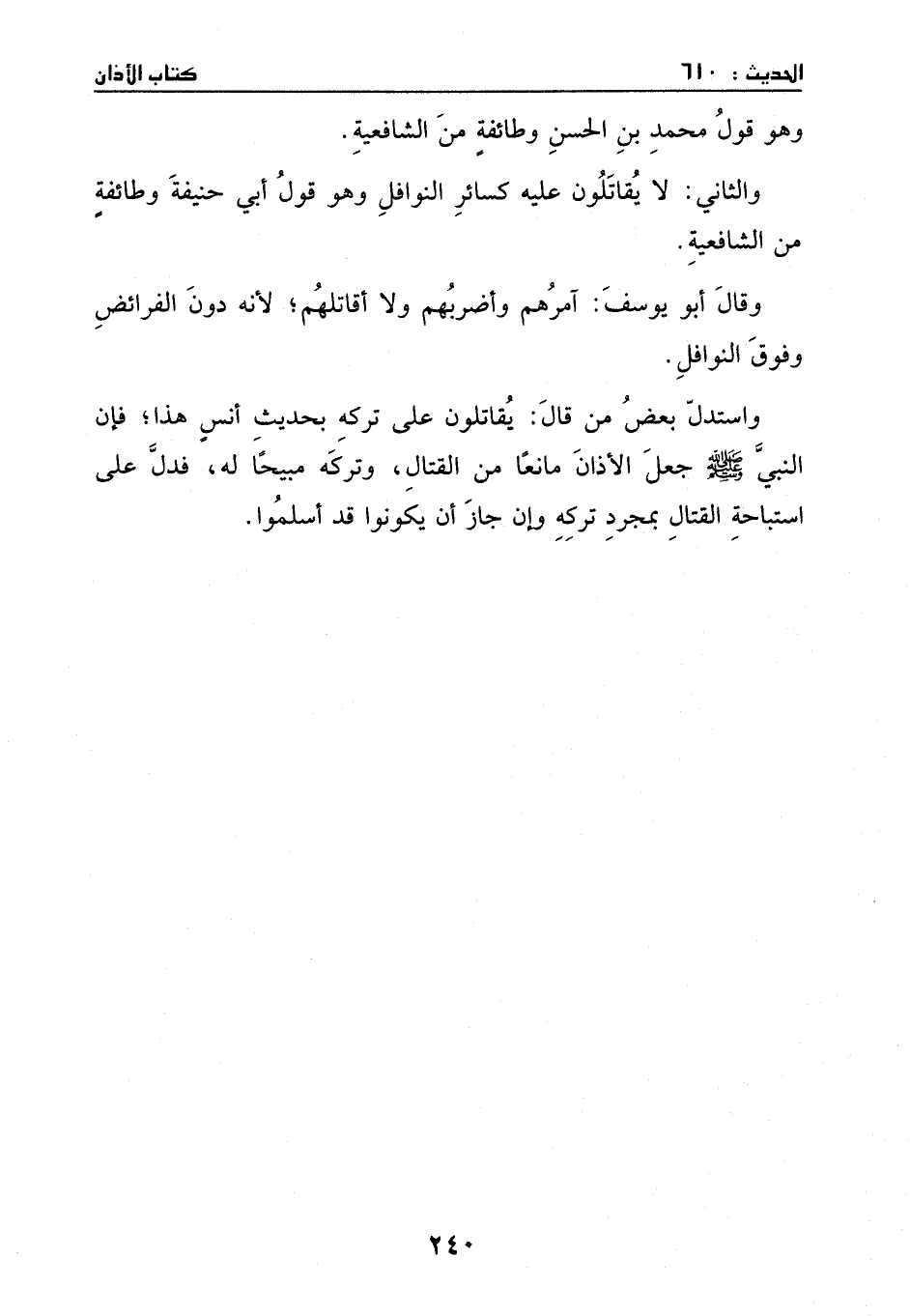 واستدل بعض من قال: يقاتلون على تركه بحديث أنس هذا؛ فإن النبي - صَلَّى اللهُ عَلَيْهِ وَسَلَّمَ - جعل الأذان مانعاً من القتال، وتركه مبيحاً له، فدل على استباحة القتال بمجرد تركه، وإن جاز ان يكونوا قد أسلموا.