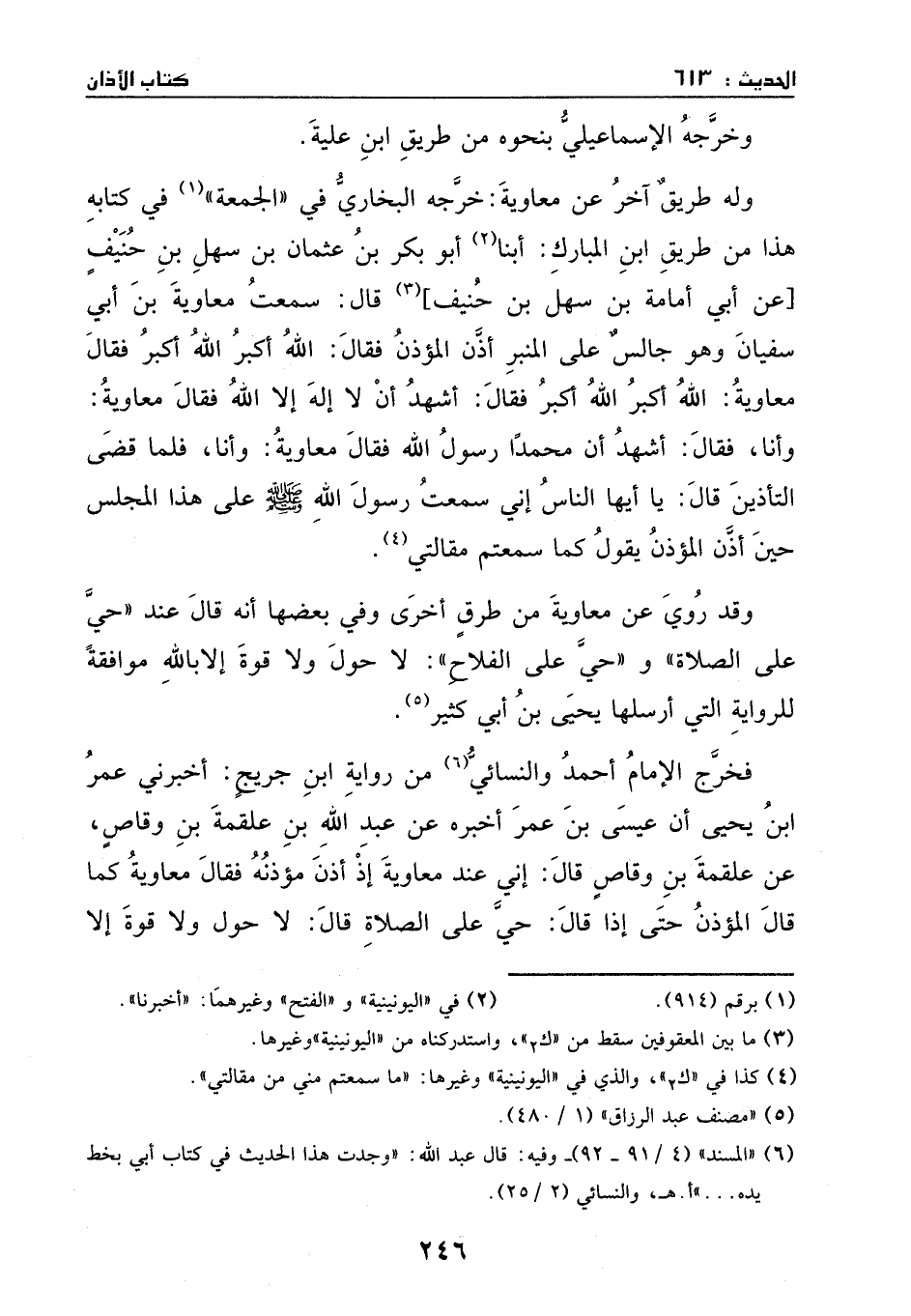 وقد روي عن معاوية من طريق أخرى، وفي بعضها: انه قال عند: (حي على الصلاة) ، (وحي على الفلاح) : (لا حول ولا قوة إلا بالله) موافقة للرواية التي أرسلها يحيى بن أبي كثير.