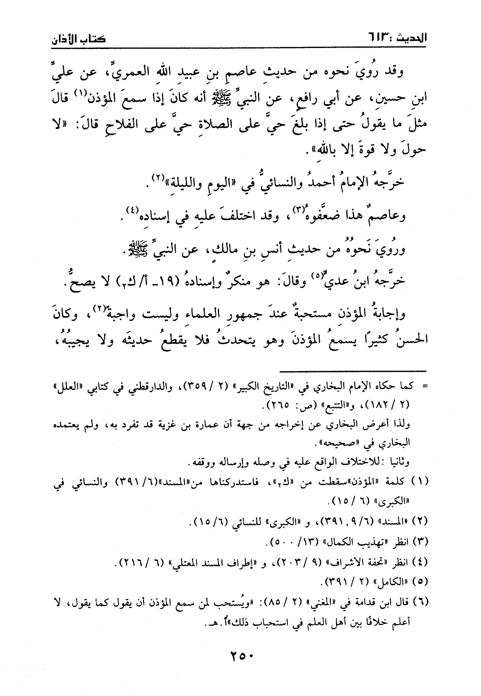 وقد روي نحوه من حديث عاصم بن عبيد الله العمري، عن علي بن حسين، عن أبي رافع، عن النبي - صَلَّى اللهُ عَلَيْهِ وَسَلَّمَ -، أنه كان إذا سمع [المؤذن] قال مثل ما يقول حتى إذا بلغ: ((حي على الصلاة، حي على الفلاح)) قال: ((لا حول ولا قوة إلا بالله)) .