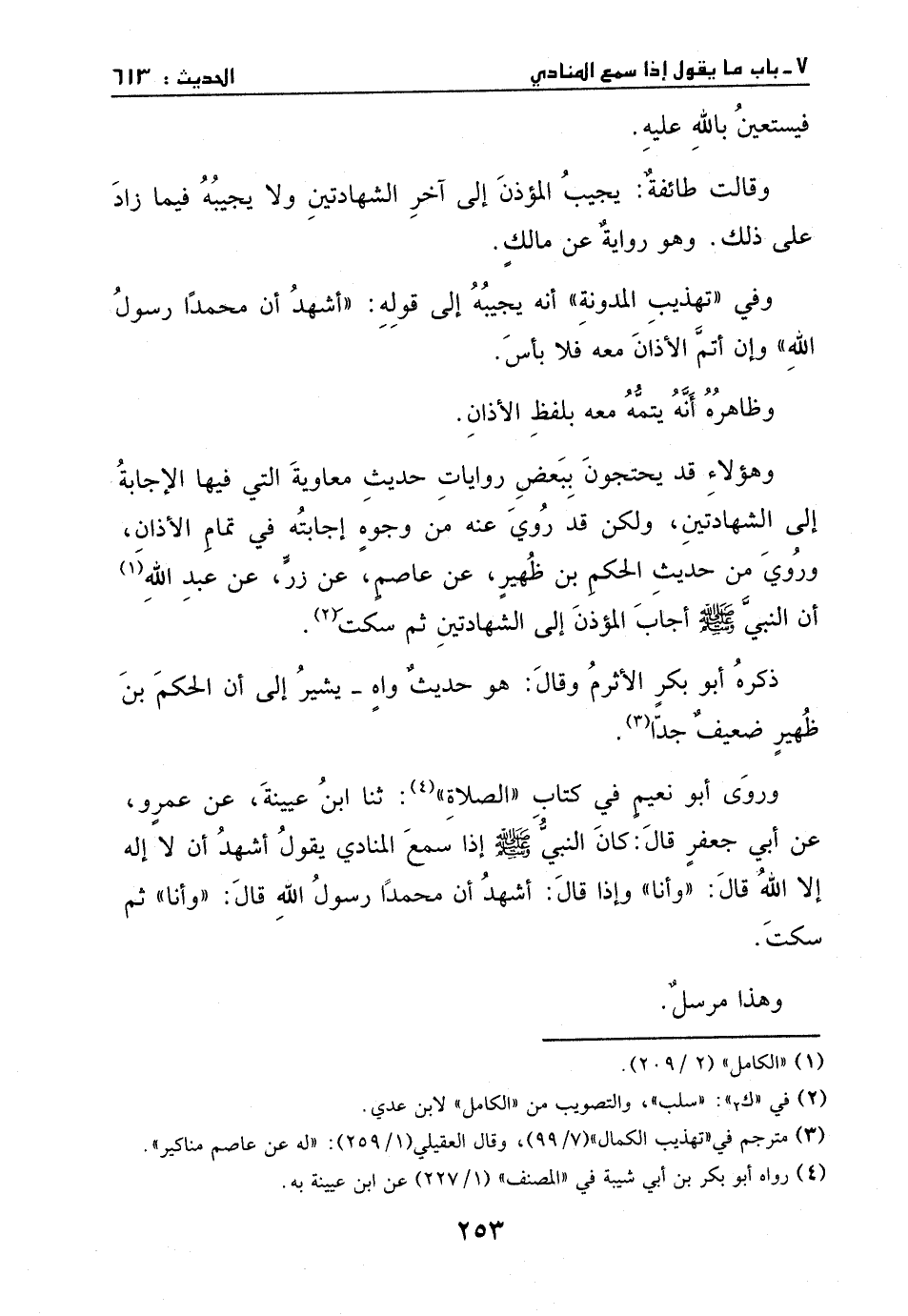 وروي من حديث الحكم بن ظهير، عن عاصم، عن زر، عن عبد الله، ان النبي - صَلَّى اللهُ عَلَيْهِ وَسَلَّمَ - اجاب المؤذن إلى الشهادتين، ثم سكت.