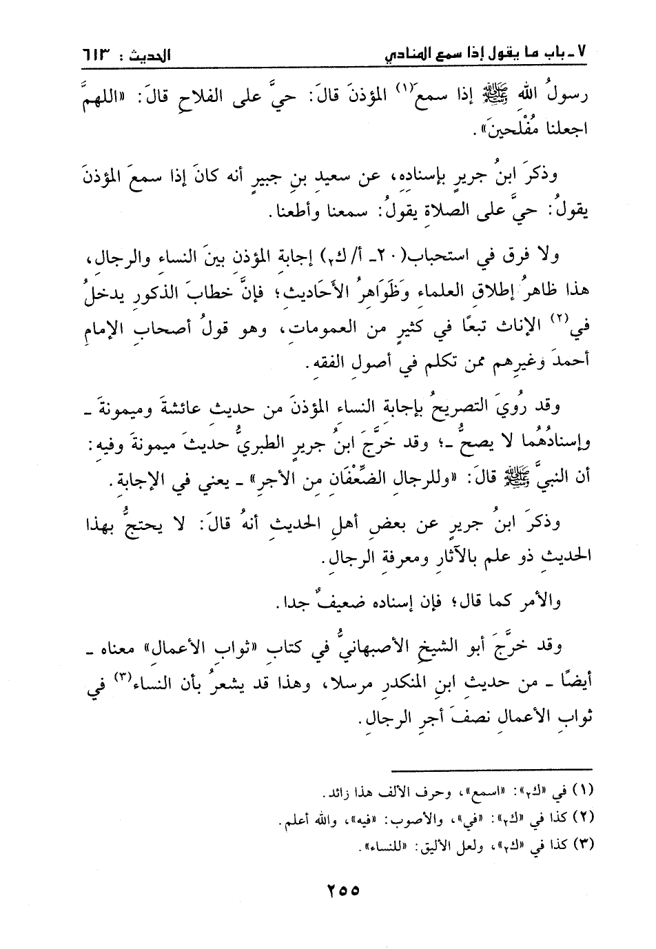 وقد خرج ابن جرير الطبري حديث ميمونة، وفيه ان النبي - صَلَّى اللهُ عَلَيْهِ وَسَلَّمَ - قال: " وللرجال الضعفان من الاجر" – يعني: في الاجابة.