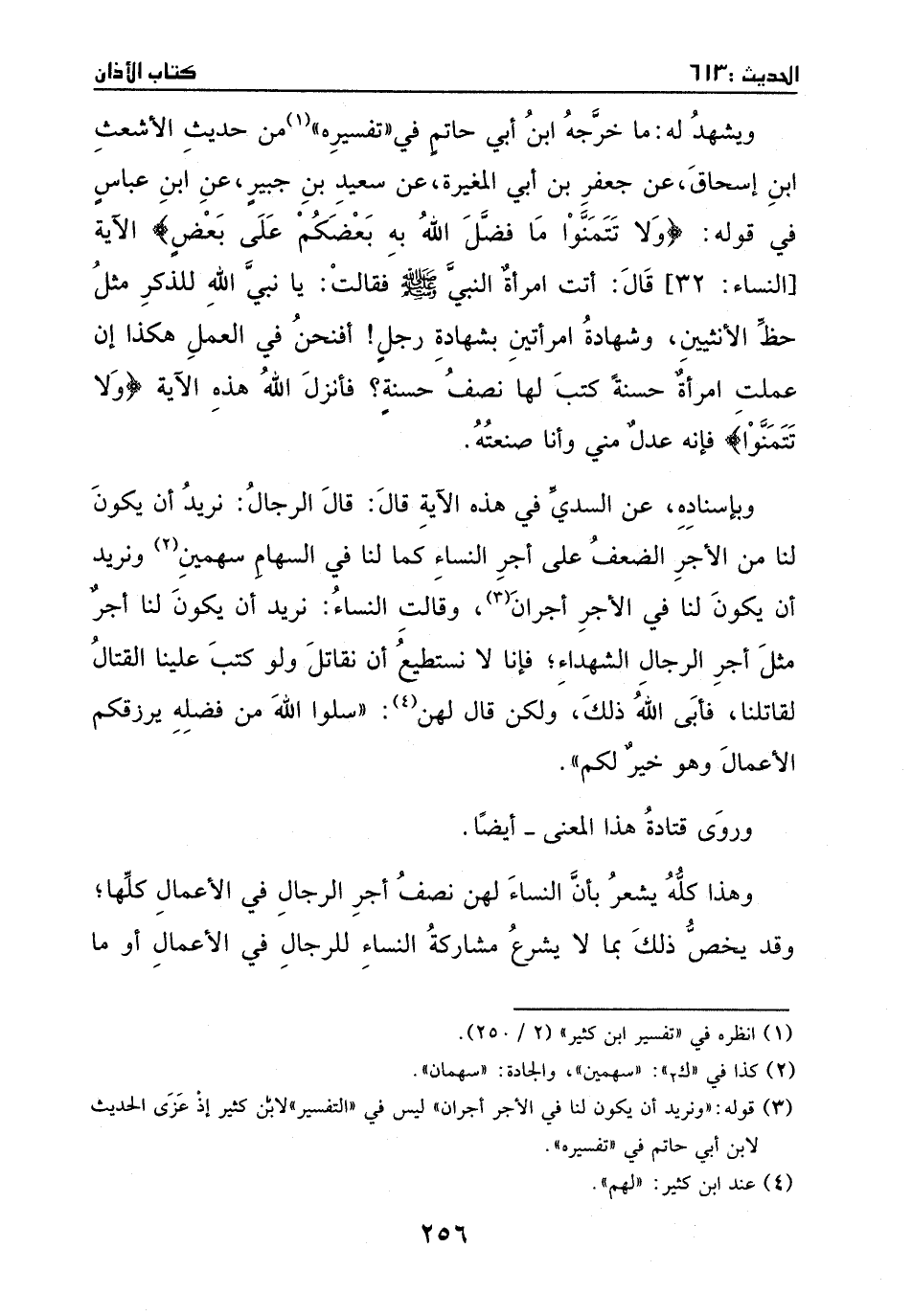 ويشهد له: ما خرجه ابن أبي حاتم في "تفسيره" من حديث الاشعث بن إسحاق، عن جعفر بن أبي المغيرة، عن سعيد بن جبير، عن أبي عباس، في قوله: {وَلا تَتَمَنَّوْا مَا فَضَّلَ اللَّهُ بِهِ بَعْضَكُمْ عَلَى بَعْضٍ} [النساء: 32] الاية، قال: اتت امرأة النبي - صَلَّى اللهُ عَلَيْهِ وَسَلَّمَ -، فقالت: يا نبي الله، للذكر مثل حظ الانثيين، وشهادة امراتين بشهادة الرجل، أفنحن في العمل هكذا، ان عملت امراة حسنة كتب لها نصف حسنة، فانزل الله هذه الاية {وَلا تَتَمَنَّوْا} ، فانه عدل مني، وانا صنعته.
