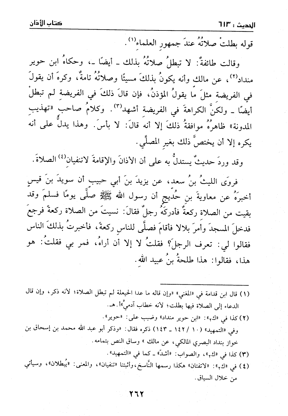 فروي الليث بن سعد، عن يزيد بن أبي حبيب، ان سويد بن قيس اخبره، عن معاوية بن حديج، انه رسول الله - صَلَّى اللهُ عَلَيْهِ وَسَلَّمَ - صلى يوماً، فسلم وقد بقيت من الصلاة ركعة، فأدركه رجل، فقال: نسيت من الصلاة ركعة، فرجع فدخل المسجد، وامر بلالا فأقام، فصلى للناس ركعة، فأخبرت بذلك الناس، فقالوا لي: تعرف الرجل؟ فقلت: لا، الا ان اراه. فمر بي، فقلت: هو هذا.