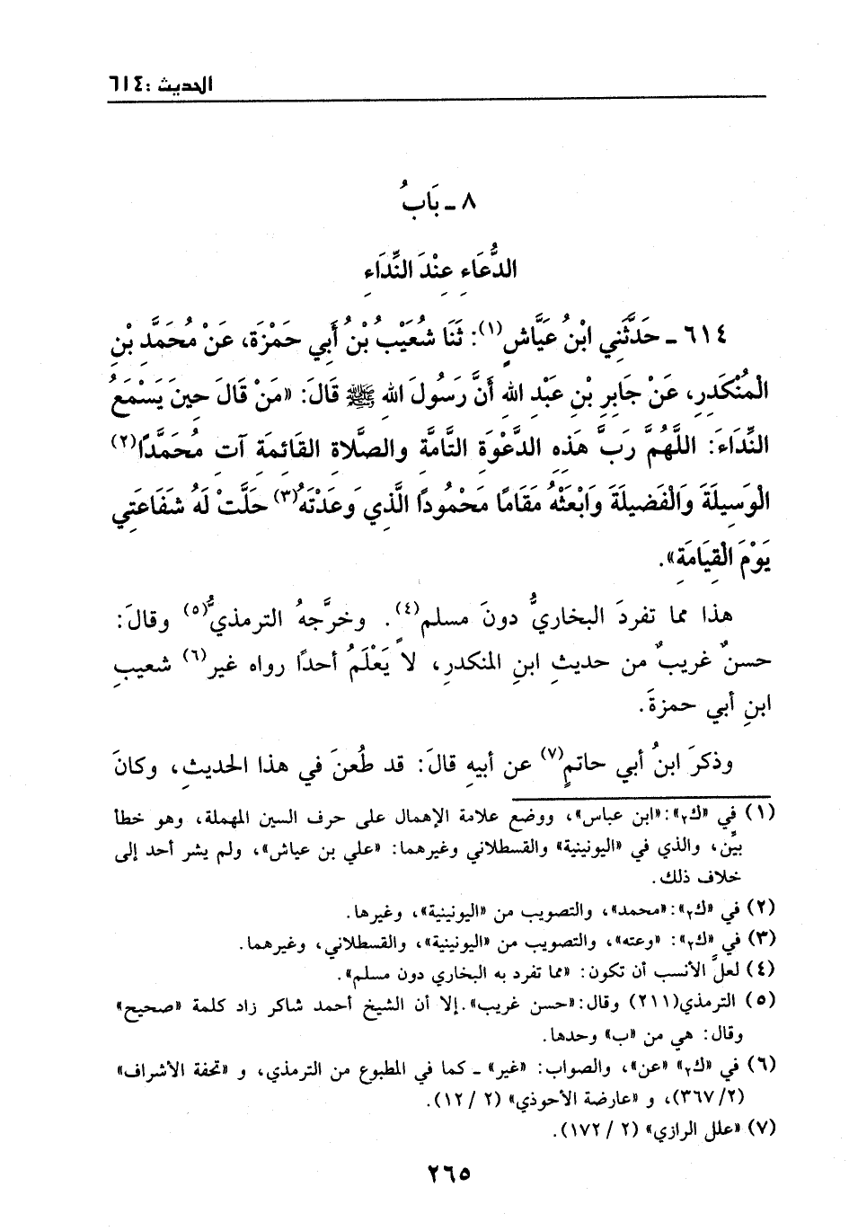 614 - حدثني ابن عياش: ثنا شعيب بي أبي حمزة، عن محمد بن المنكدر، عن جابر بن عبد الله، ان رسول الله - صَلَّى اللهُ عَلَيْهِ وَسَلَّمَ - قال: ((من قال حين يسمع النداء: اللهم، رب هذه الدعوة التامة، والصلاة القائمة، ات محمد الوسيلة والفضيلة، وابعثه مقأمامحموداً الذي وعدته، حلت له شفاعتي يوم القيامة)) .