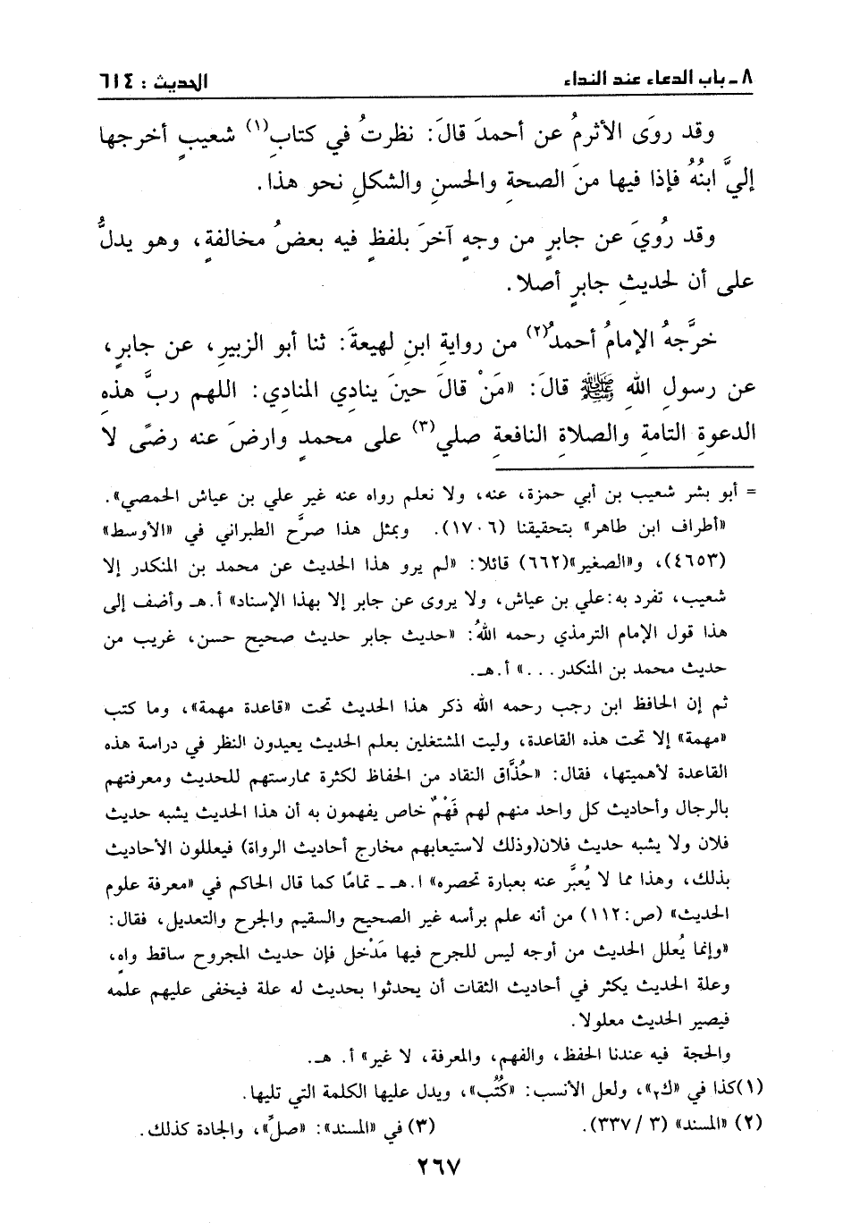 خرجه الامام أحمد من رواية ابن لهيعة: ثنا ابو الزبير، عن جابر، عن رسول الله - صَلَّى اللهُ عَلَيْهِ وَسَلَّمَ -، قال: "من قال حين ينادي المنادي: اللهم، رب هذه الدعوة التامة والصلاة النافعة، صل على محمد وارض عنه رضا لا