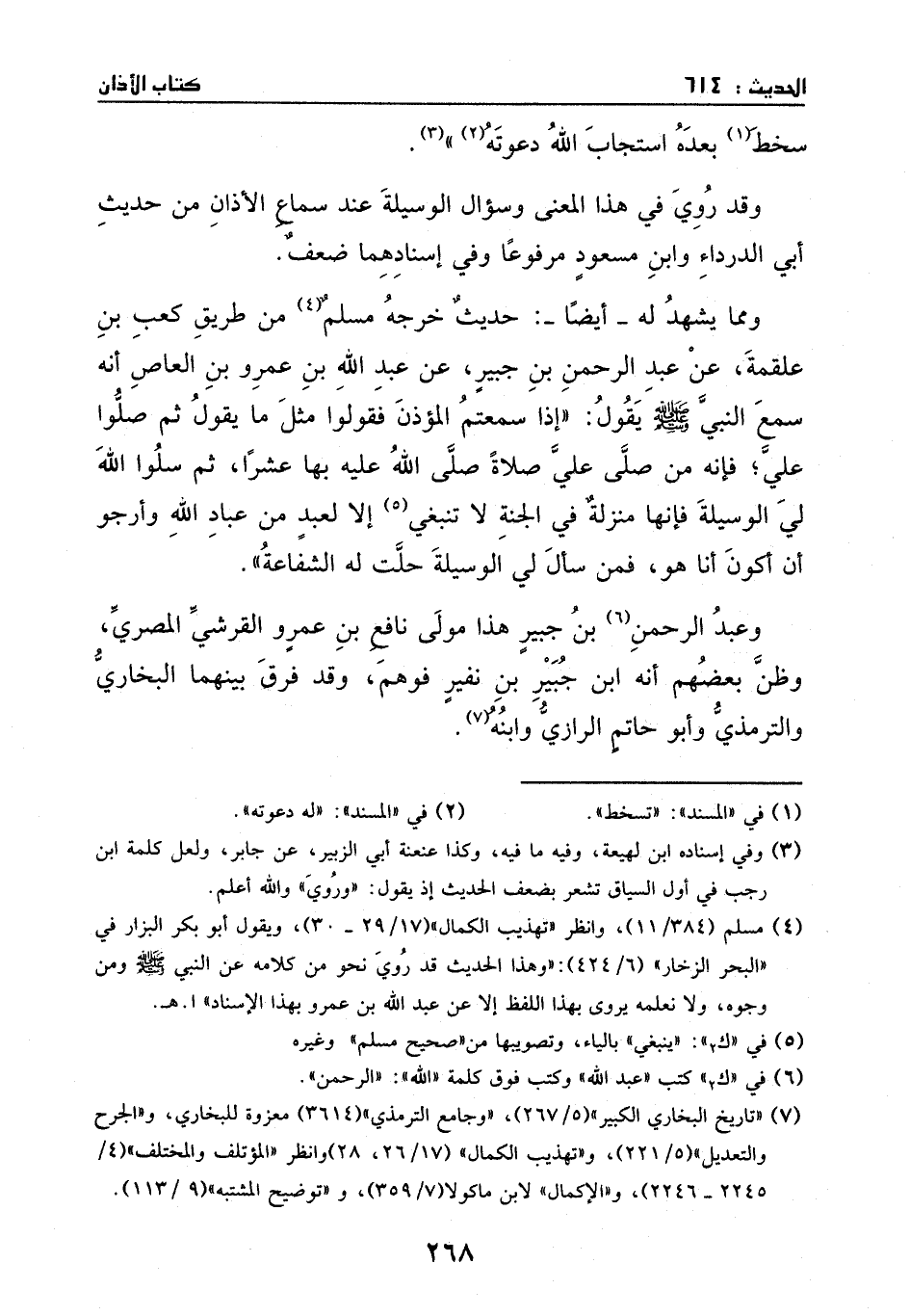 ومما يشهد له – أيضا -: حديث خرجه مسلم من طريق كعب بن علقمة، عن عبد الرحمن بن جبير، عن عبد الله بن عمرو بن العاص، انه سمع النبي - صَلَّى اللهُ عَلَيْهِ وَسَلَّمَ - يقول: (إذا سمعتم المؤذن فقولوا مثل ما يقول، ثم صلوا علي؛ فانه من صلى علي صلاة صلى الله عليه بها عشراً، ثم سلوا الله لي الوسيلة؛ فانها منزلة في الجنة لا تنبغي الا لعبد من عباد الله، وارجو ان اكون انا هو، فمن سأل لي الوسيلة حلت له الشفاعة) .