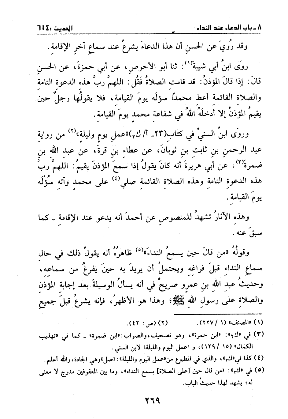 روي ابن أبي شيبة: ثنا ابو الاحوص، عن أبي حمزة، عن الحسن، قال: إذا قال المؤذن: (قد قامت الصلاة) ، فقل: اللهم، رب هذه الدعوة التامة والصلاة القائمة، اعط محمداً سؤله يوم القيامة. فلا يقولها رجل حين يقيم المؤذن الا ادخله الله في شفاعة محمد يوم القيامة.