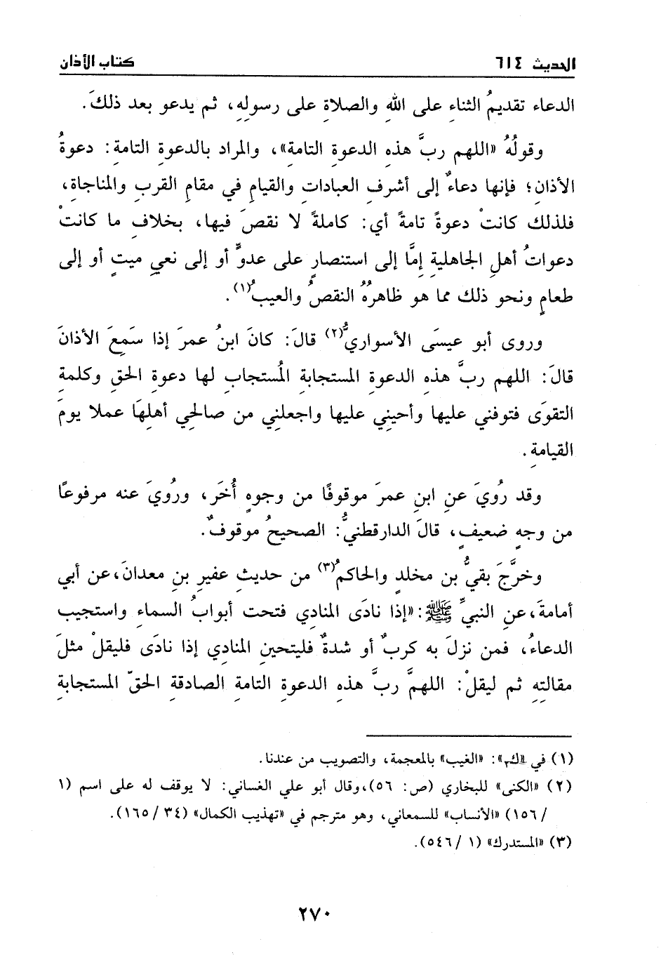 وروى ابو عيسى الاسواري، قال: كان ابن عمر إذا سمع الاذان قال: اللهم رب هذه الدعوة المستجابة المستجاب لها، دعوة الحق وكلمة التقوى، فتوفني عليها، واحيني عليها، واجعلني من صالح اهلها عملاً يوم القيامة.
