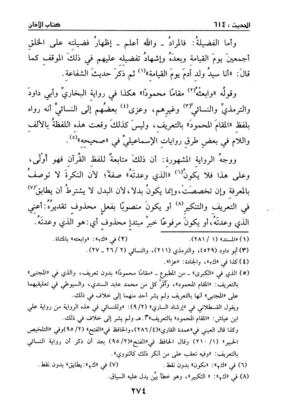 وعزا بعضهم إلى النسائي، انه رواه بلفظ: ((المقام المحمود)) بالتعريف، وليس كذلك.