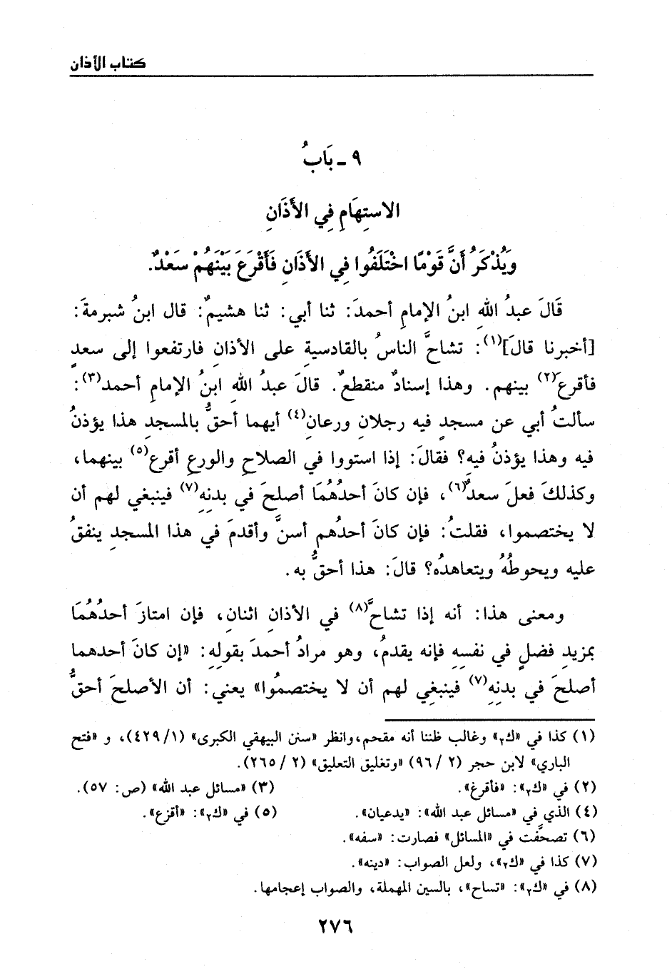 قال عبد الله ابن الامام أحمد: ثنا أبي: ثنا هشيم، قال: ابن شبرمة اخبرنا، قال: تشاح الناس بالقادسية على الاذان، فارتفعوا إلى سعد، فأقرع بينهم.