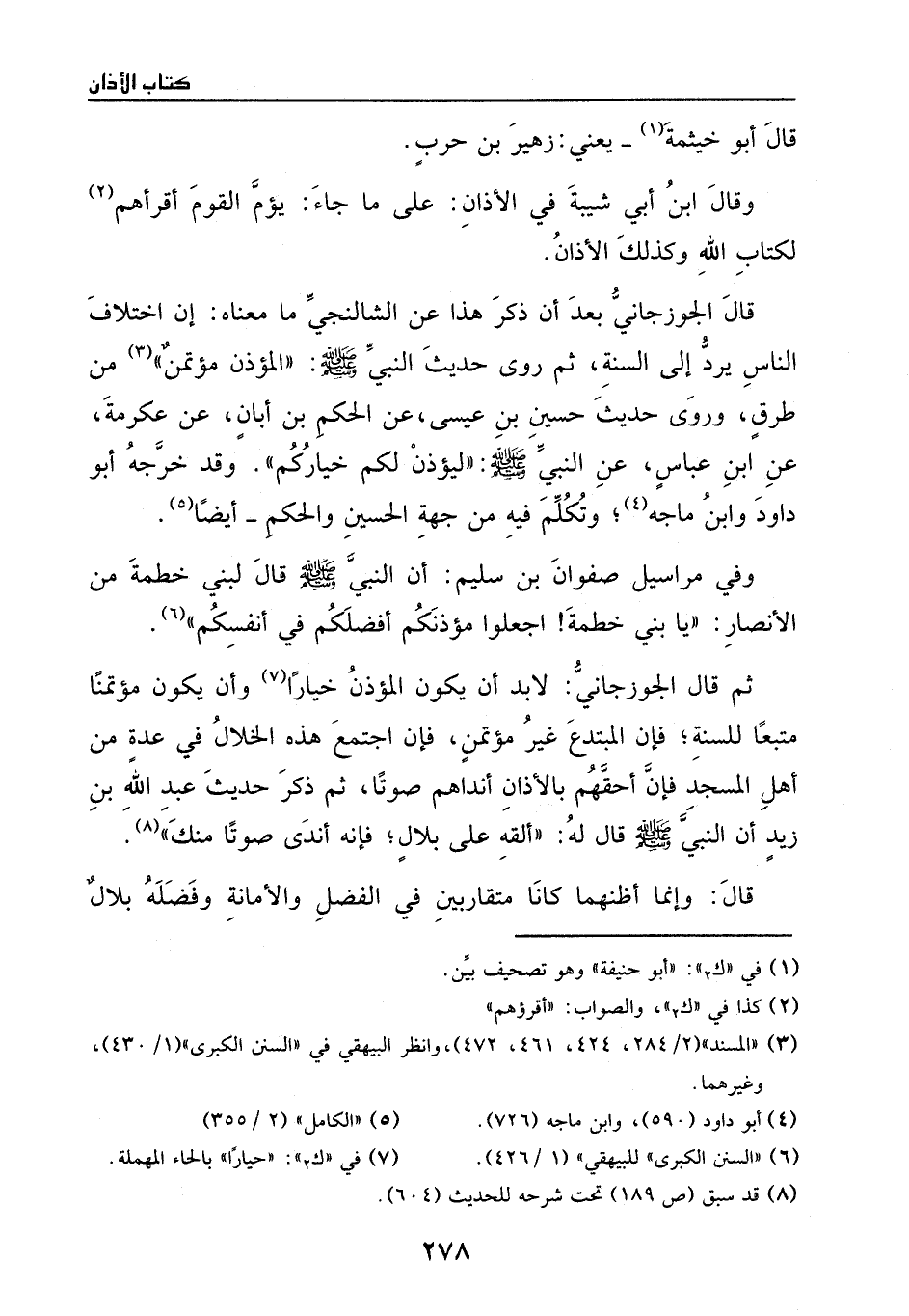 ثم قال الجوزجاني: لا بد ان يكون المؤذن خياراً، وبأن يكون مؤتمناً متبعاً للسنة، فالمبتدع غير مؤتمن. فإن اجتمع هذه الخلال في عدة من اهل المسجد، فإن أحقهم بالأذان أنداهم صوتا.