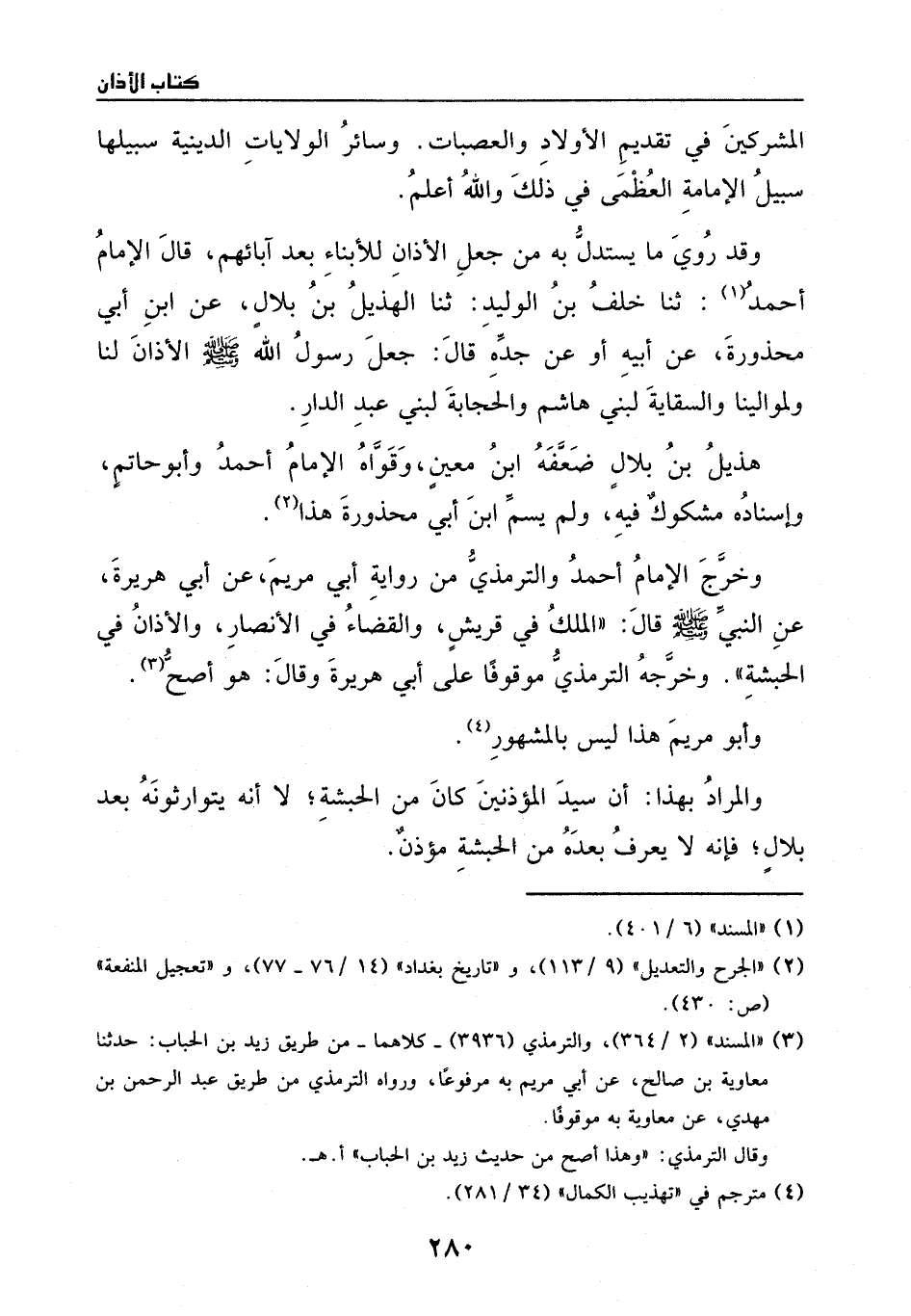 قال الامام أحمد: ثنا خلف بن الوليد: ثنا الهذيل بن بلال، عن ابن أبي محذورة، عن أبيه - او جده -، قال: جعل رسول الله - صَلَّى اللهُ عَلَيْهِ وَسَلَّمَ - الاذان لنا ولموالينا، والسقاية لبني هاشم، والحجابة لبني عبد الدار.