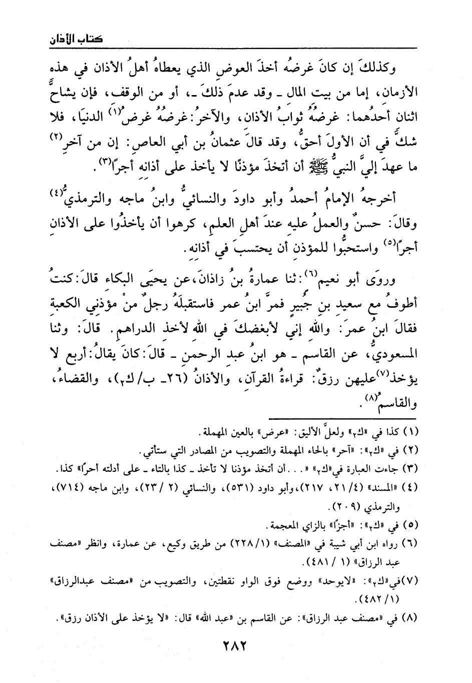 قال: وثنا المسعودي، عن القاسم - هو: ابن عبد الرحمن -، قال: كان يقال: اربع لا يؤخذ عليهن رزق: قراءة القرآن، والاذان، والقضاء، والمقاسم.
