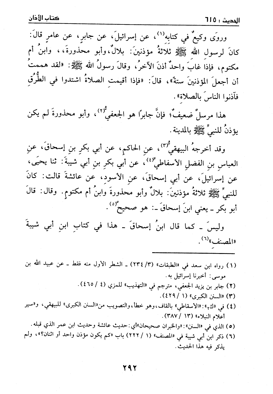 وروى وكيع في ((كتابه)) ، عن اسرائيل، عن جابر، عن عامر: كان لرسول الله - صَلَّى اللهُ عَلَيْهِ وَسَلَّمَ - ثلاثة مؤذنين: بلال وابو محذورة وابن ام مكتوم، فإذا غاب واحد اذن الاخر. وقال رسول الله - صَلَّى اللهُ عَلَيْهِ وَسَلَّمَ -: ((لقد هممت ان اجعل المؤذنين ستة)) . قال: فإذا اقيمت الصلاة اشتدوا في الطرق، فاذنوا الناس بالصلاة.