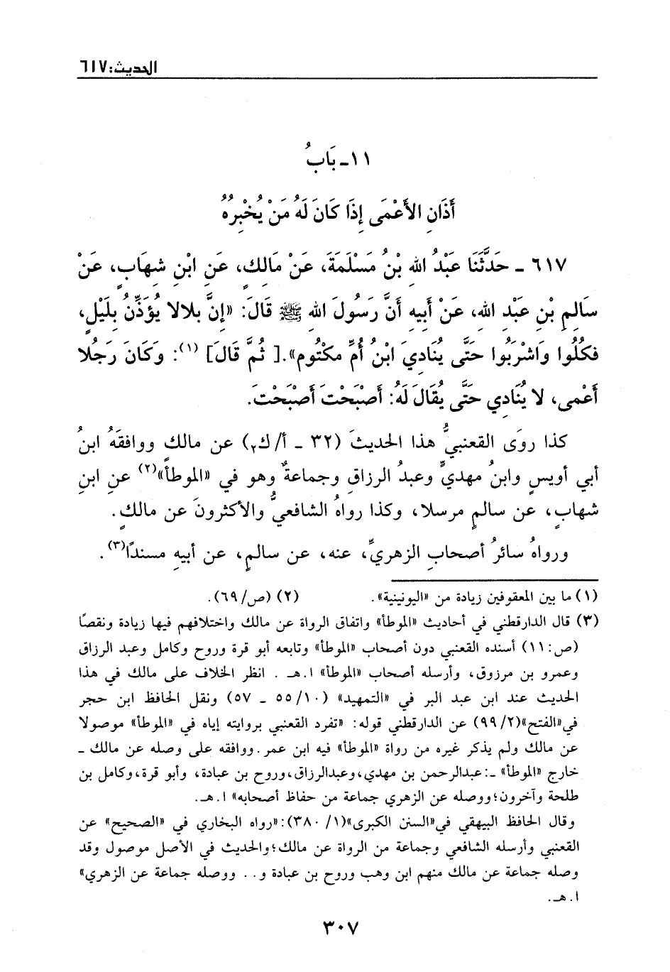 617 - حدثنا عبد الله بن مسلمة، عن مالك، عن ابن شهاب، عن سالم بن عبد الله، عن أبيه، ان رسول الله - صَلَّى اللهُ عَلَيْهِ وَسَلَّمَ - قال: ((ان بلالا يؤذن بليل، فكلوا واشربوا حتى ينادي ابن ام مكتوم)) ، وكان رجلاً اعمى، لاينادي حتى يقال له: اصبحت، اصبحت.
