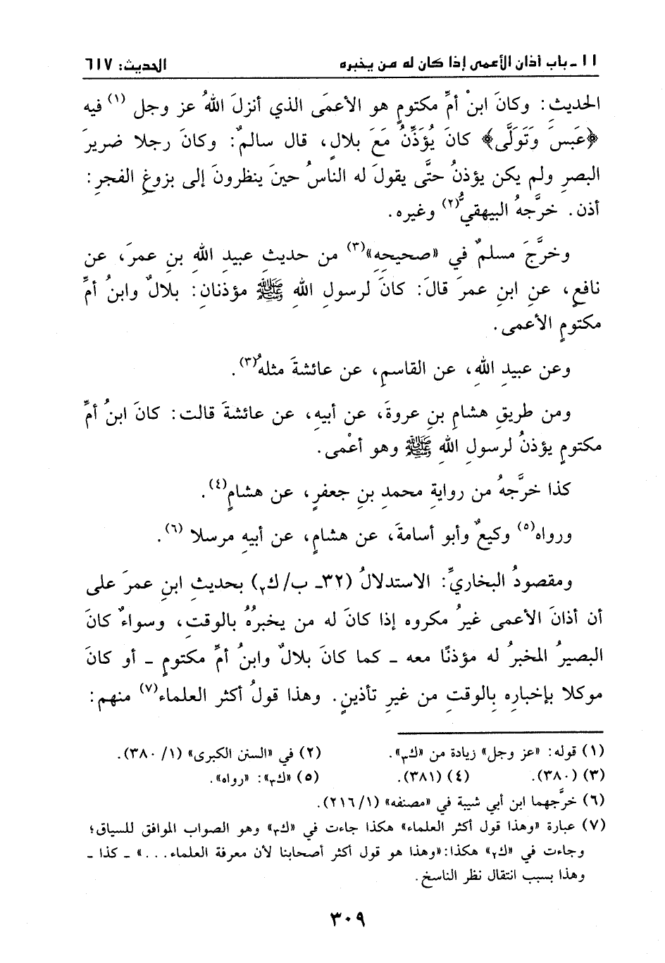 ومن طريق هشام بن عروة، عن أبيه، عن عائشة، قالت: كان ابن ام مكتوم يؤذن لرسول الله - صَلَّى اللهُ عَلَيْهِ وَسَلَّمَ - وهو اعمى.