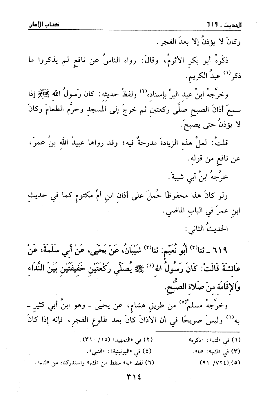 وخرجه ابن عبد البر بإسناده، ولفظ حديثه: كان رسول الله - صَلَّى اللهُ عَلَيْهِ وَسَلَّمَ - إذا سمع أذان الصبح صلى ركعتين، ثم خرج إلى المسجد، وحرم الطعام، وكان لا يؤذن حتى يصبح.