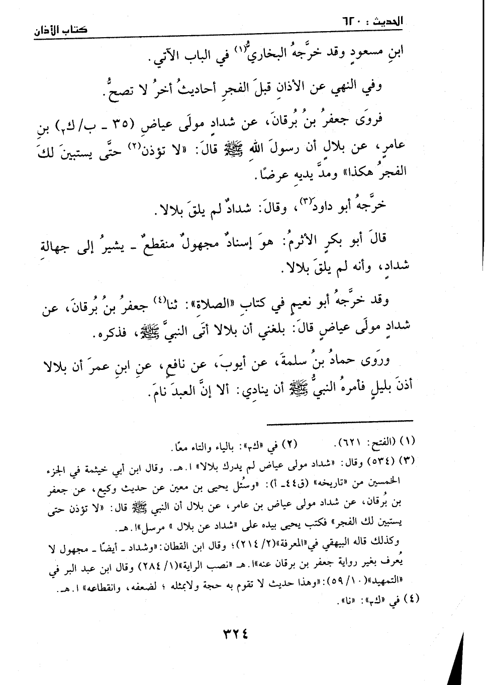 فروى جعفر بن برقان، عن شداد مولى عياض بن عامر، عن بلال، ان رسول الله - صَلَّى اللهُ عَلَيْهِ وَسَلَّمَ - قال: ((لا تؤذن حتى يستبين لك الفجر هكذا)) ، ومد يديه عرضاً.