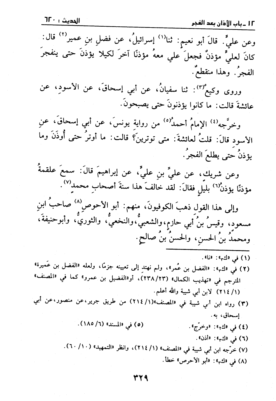 وعن شريك، عن علي بن علي، عن إبراهيم، قال: سمع علقمة مؤذناً يؤذن بليل، فقال: لقد خالف هذا سنة أصحاب محمد.