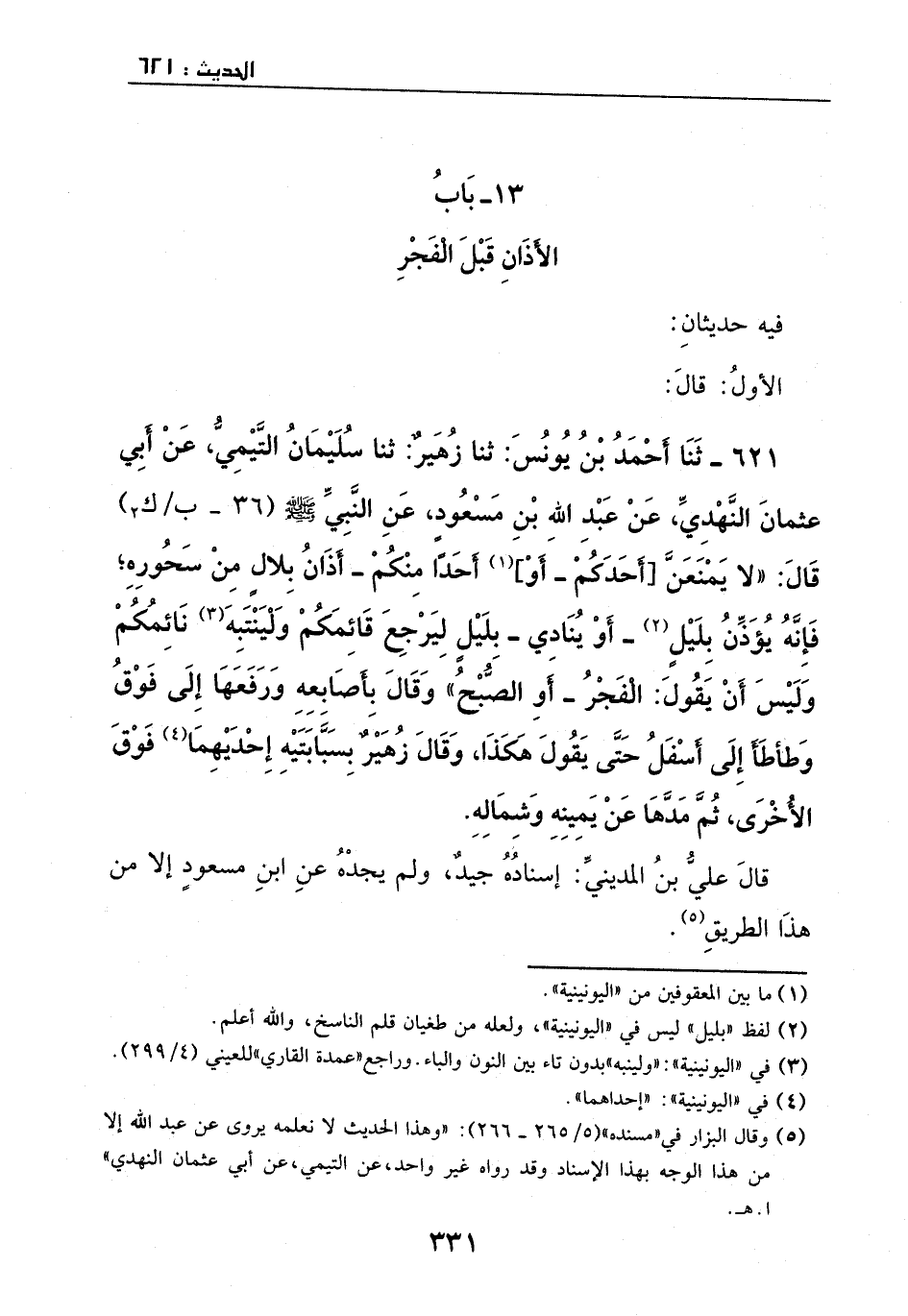 621 - ثنا أحمد بن يونس: ثنا زهير: ثنا سليمان التيمي، عن أبي عثمان النهدي، عن عبد الله بن مسعود، عن النبي - صَلَّى اللهُ عَلَيْهِ وَسَلَّمَ -، قال: ((لا يمنعن [أحدكم – أو] أحدا منكم - أذان بلال من سحوره، فإنه يؤذن بليل - أو ينادي بليل - ليرجع قائمكم، ولينبه نائمكم، وليس أن يقول الفجر أو الصبح)) - وقال بأصابعه ورفعها إلى فوق وطأطأ إلى أسفل حتى يقول هكذا. وقال زهير: بسبابته إحدهما فوق الاخرى، ثم مدها عن يمينه وشماله.