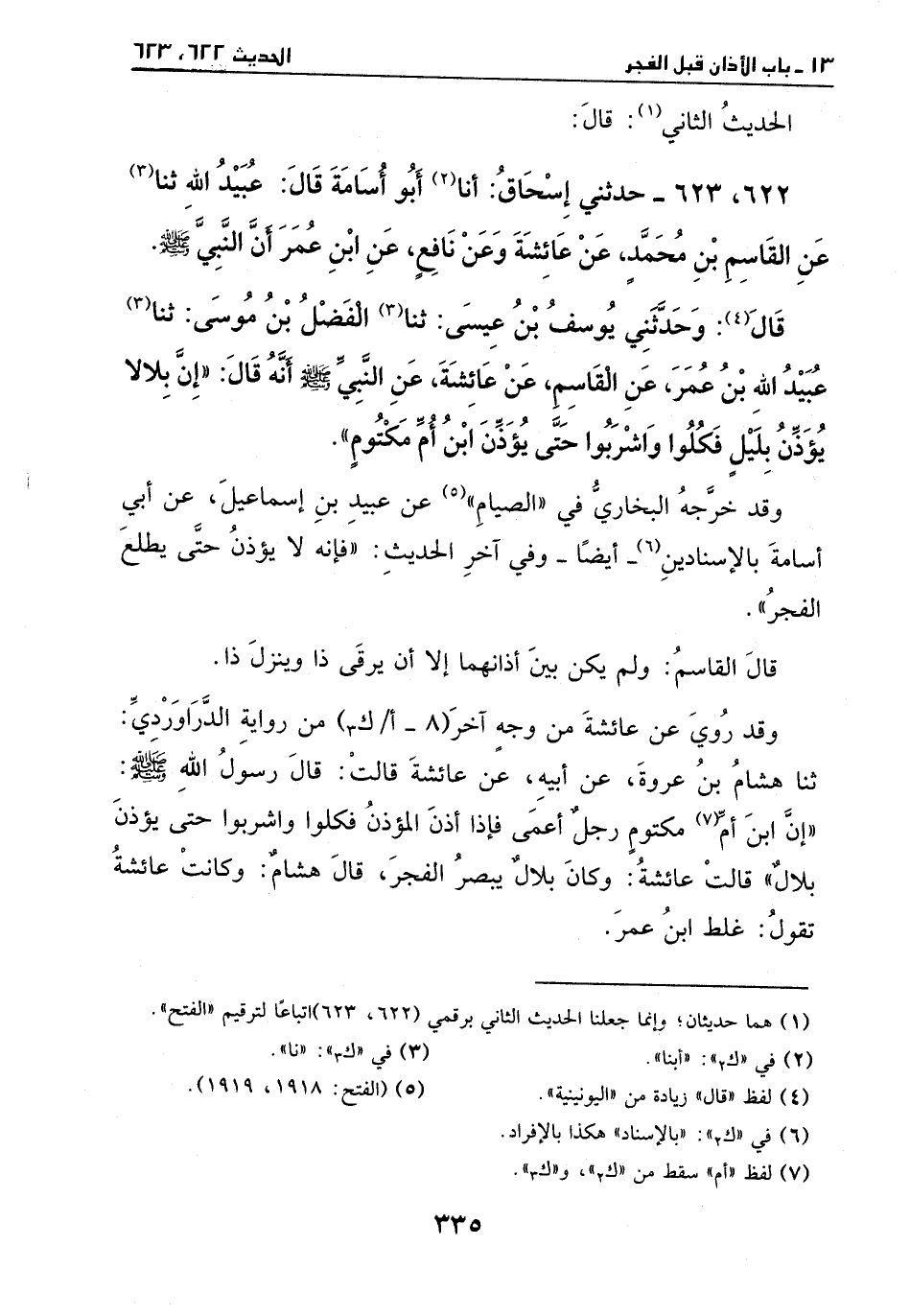 623 - وحدثني يوسف بن عيسى: ثنا الفضل بن موسى: ثنا عبيد الله بن عمر، عن القاسم، عن عائشة، عن النبي - صَلَّى اللهُ عَلَيْهِ وَسَلَّمَ -، أنه قال: ((إن بلالاً يؤذن بليلٍ، فكلوا واشربوا حتى يؤذن ابن أم مكتوم)) .