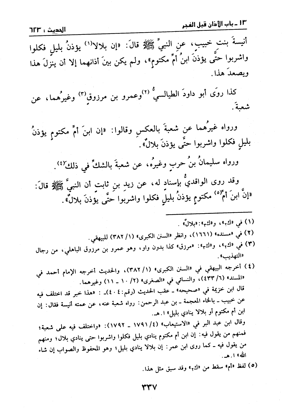 أنيسة بنت خبيب، عن النبي - صَلَّى اللهُ عَلَيْهِ وَسَلَّمَ -، قال: ((إن بلالاً يؤذن بليل فكلوا واشربوا حتى يؤذن ابن أم مكتوم)) . ولم يكن بين أذانهما إلا أن ينزل هذا ويصعد هذا.