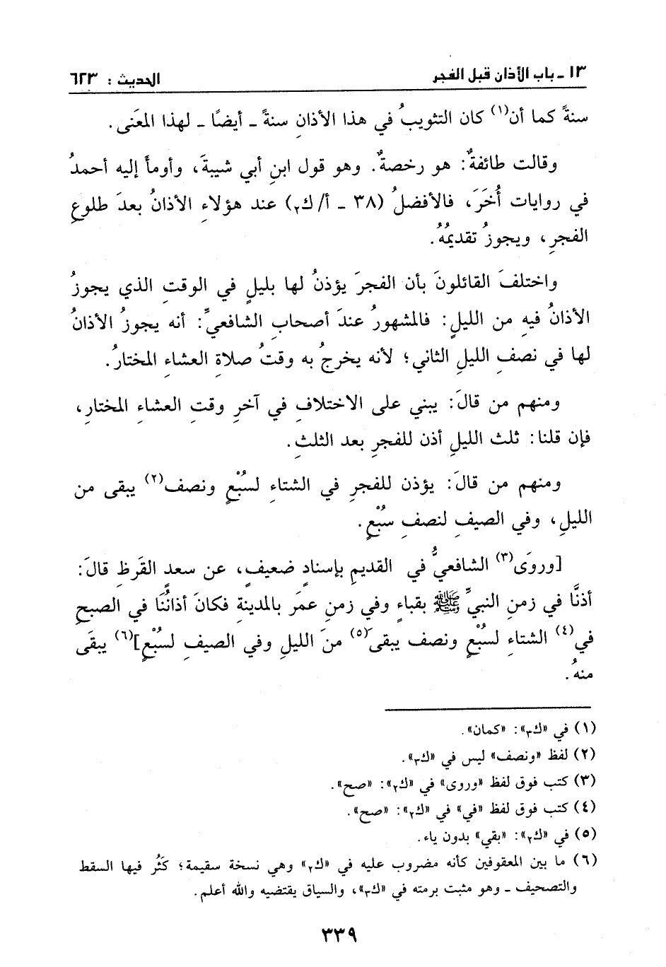 وروى الشافعي في القديم بإسناد ضعيف، عن سعد القرظ، قال: أذنا في زمن النبي - صَلَّى اللهُ عَلَيْهِ وَسَلَّمَ - بقباء، وفي زمن عمر بالمدينة، فكان أذاننا في الصبح في الشتاء لسبع ونصف بقي من الليل، وفي الصيف [لسبع] يبقى منه.