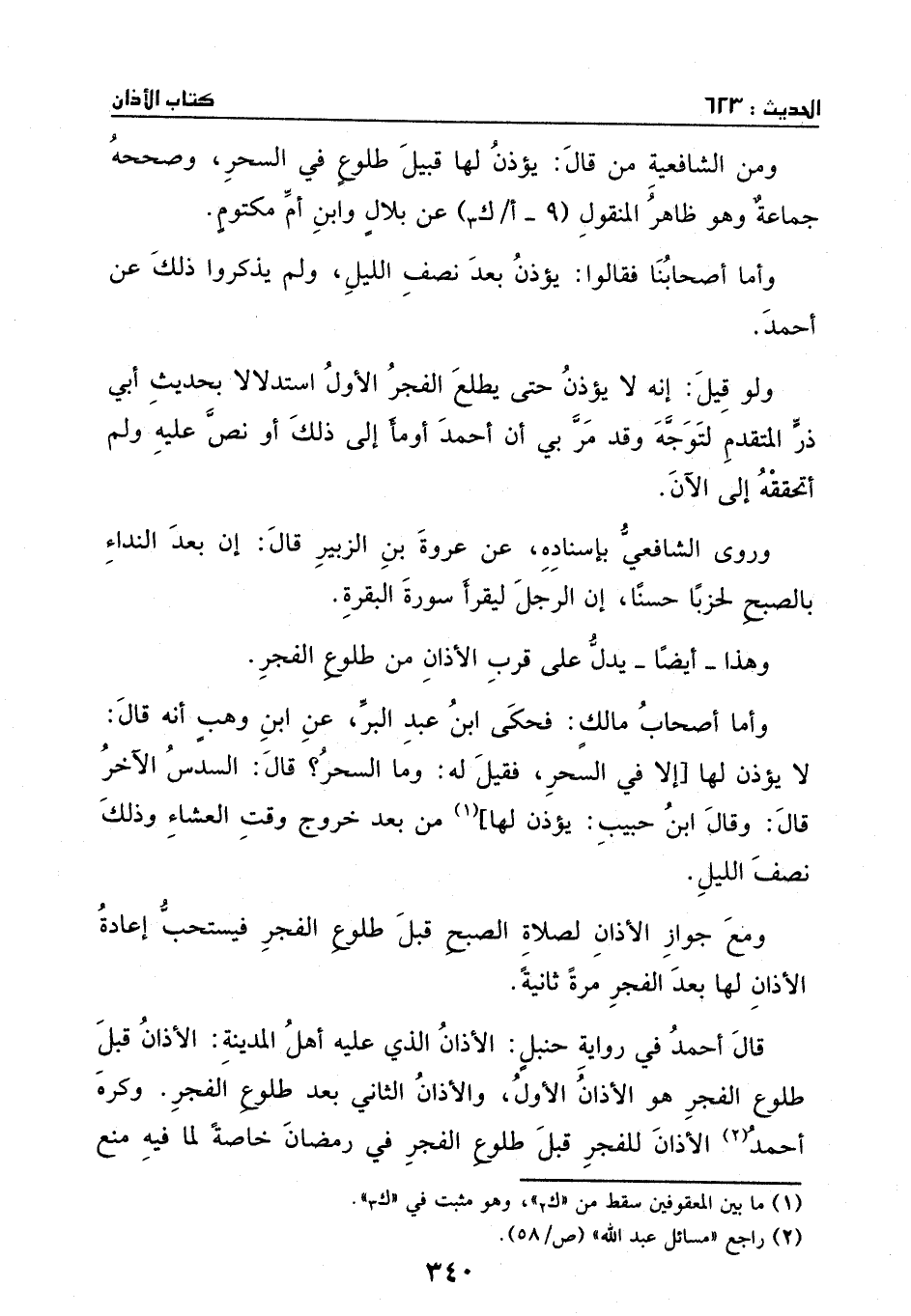 قال أحمد - في رواية حنبل -: الأذان الذي عليه أهل المدينة الأذان قبل طلوع الفجر، هو الأذان الأول، والأذان الثاني بعد طلوع الفجر.