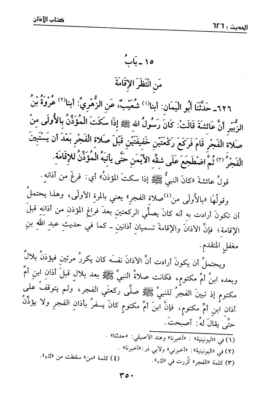 626 - حدثنا ابو اليمان: أبنا شعيب، عن الزهري: أبنا عروة بن الزبير، أن عائشة قالت: كان رسول الله - صَلَّى اللهُ عَلَيْهِ وَسَلَّمَ - إذا سكت المؤذن بالأولى من صلاة الفجر قام فركع ركعتين خفيفتين قبل صلاة الفجر بعد أن يستبين الفجر، ثم اضطجع على شقه الأيمن حتى يأتيه المؤذن للإقامة.