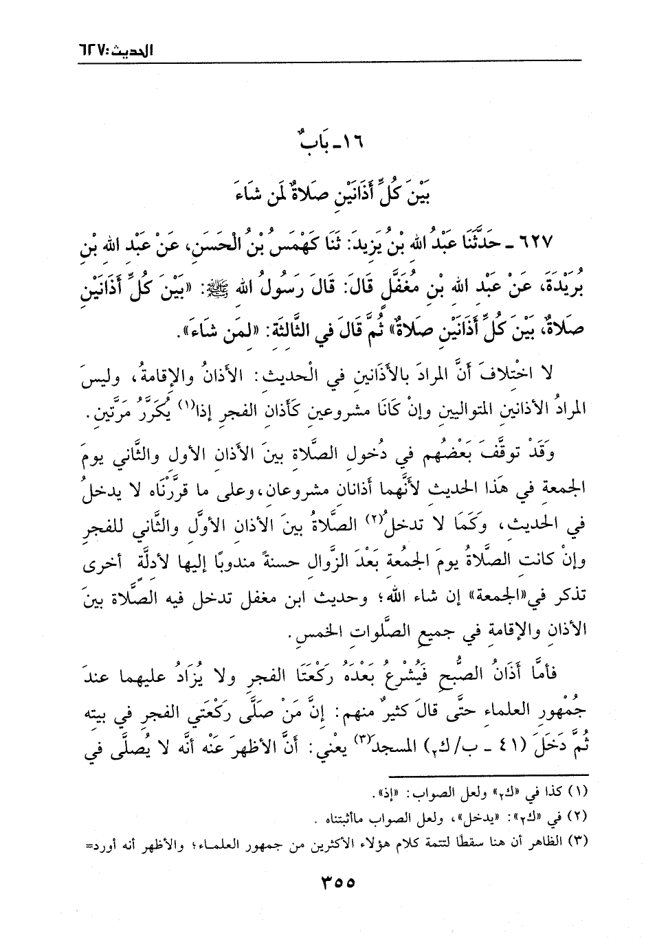 627 - حدثنا عبد الله بن يزيد: ثنا كهمس بن الحسن، عن عبد الله بن بريدة، عن عبد الله بن مغفل، قال: قال رسول الله - صَلَّى اللهُ عَلَيْهِ وَسَلَّمَ -: " بين كل أذانين صلاة، بين كل أذانين صلاة، ثم قال في الثالثة: " لمن شاء ".