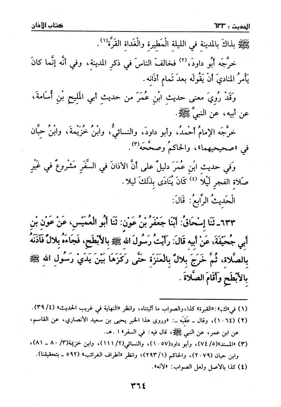 633 - ثنا إسحاق: ابنا جعفر بن عون: ثنا ابو العميس، عن عون بن أبي جحيفة، عن أبيه، قال: رأيت رسول الله - صَلَّى اللهُ عَلَيْهِ وَسَلَّمَ - بالابطح، فجاءه بلال فاذنه بالصلاة، ثم خرج بلال بالعنزة حتى ركزها بين يدي رسول الله - صَلَّى اللهُ عَلَيْهِ وَسَلَّمَ - بالابطح، واقام الصلاة.