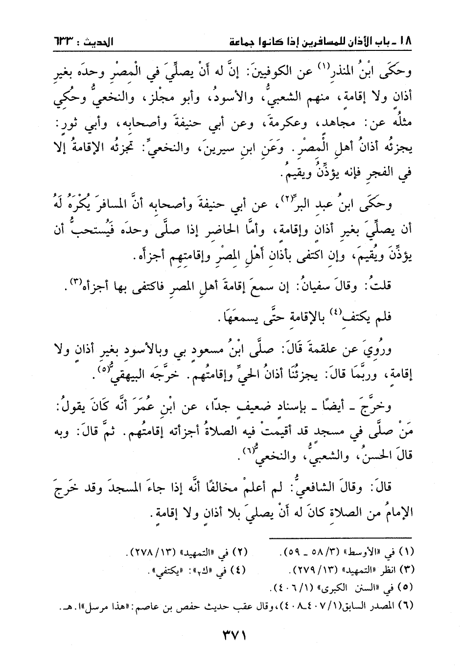 وحكى ابن عبد البر، عن أبي حنيفة وأصحابه: أن المسافر يكره له أن يصلي بغير أذان وإقامة، وأما الحاضر إذا صلى وحده فيستحب أن يؤذن ويقيم، وإن اكتفى بأذان أهل المصر وإقامتهم أجزأه.