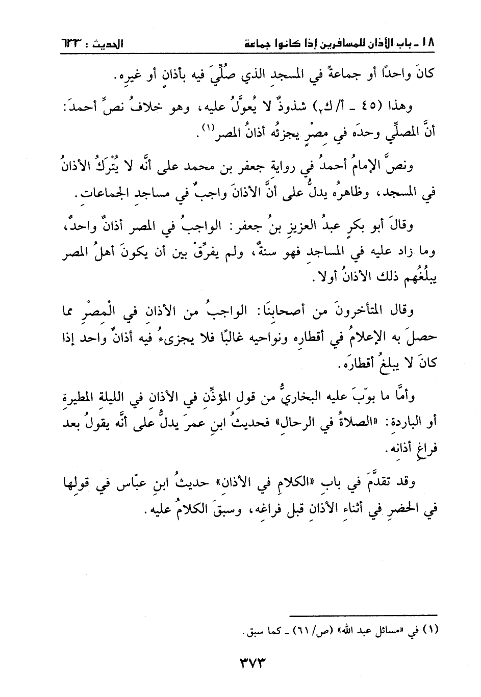 وقال أبو بكر عبد العزيز بن جعفر: الواجب في المصر أذان واحد، وما زاد عليه في المساجد فهو سنة.