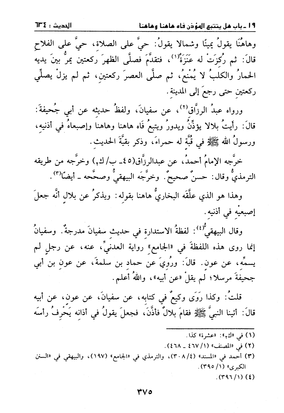 ورواه عبد الرزاق، عن سفيان، ولفظ حديثه: عن أبي جحيفة، قال: رأيت بلالاً يؤذن ويدور ويتتبع فاه هاهنا وهاهنا، وإصبعاه في اذنيه، ورسول الله - صَلَّى اللهُ عَلَيْهِ وَسَلَّمَ - في قبة له حمراء - وذكر بقية الحديث.