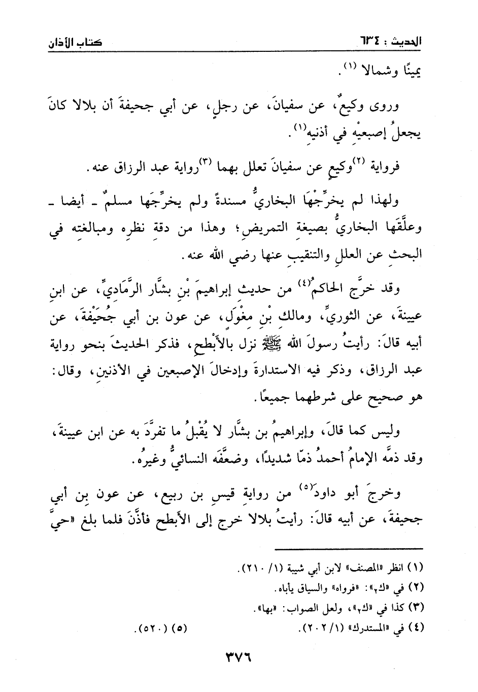 وقد خرج الحاكم من حديث إبراهيم بن بشار الرمادي، عن ابن عيينة، عن الثوري ومالك بن مغول، عن عون بن أبي جحيفة، عن أبيه، قال: رأيت رسول الله - صَلَّى اللهُ عَلَيْهِ وَسَلَّمَ - نزل بالأبطح - فذكر الحديث بنحو رواية عبد الرزاق، وذكر فيه الاستداره، وإدخال الإصبعين في الأذنين.
