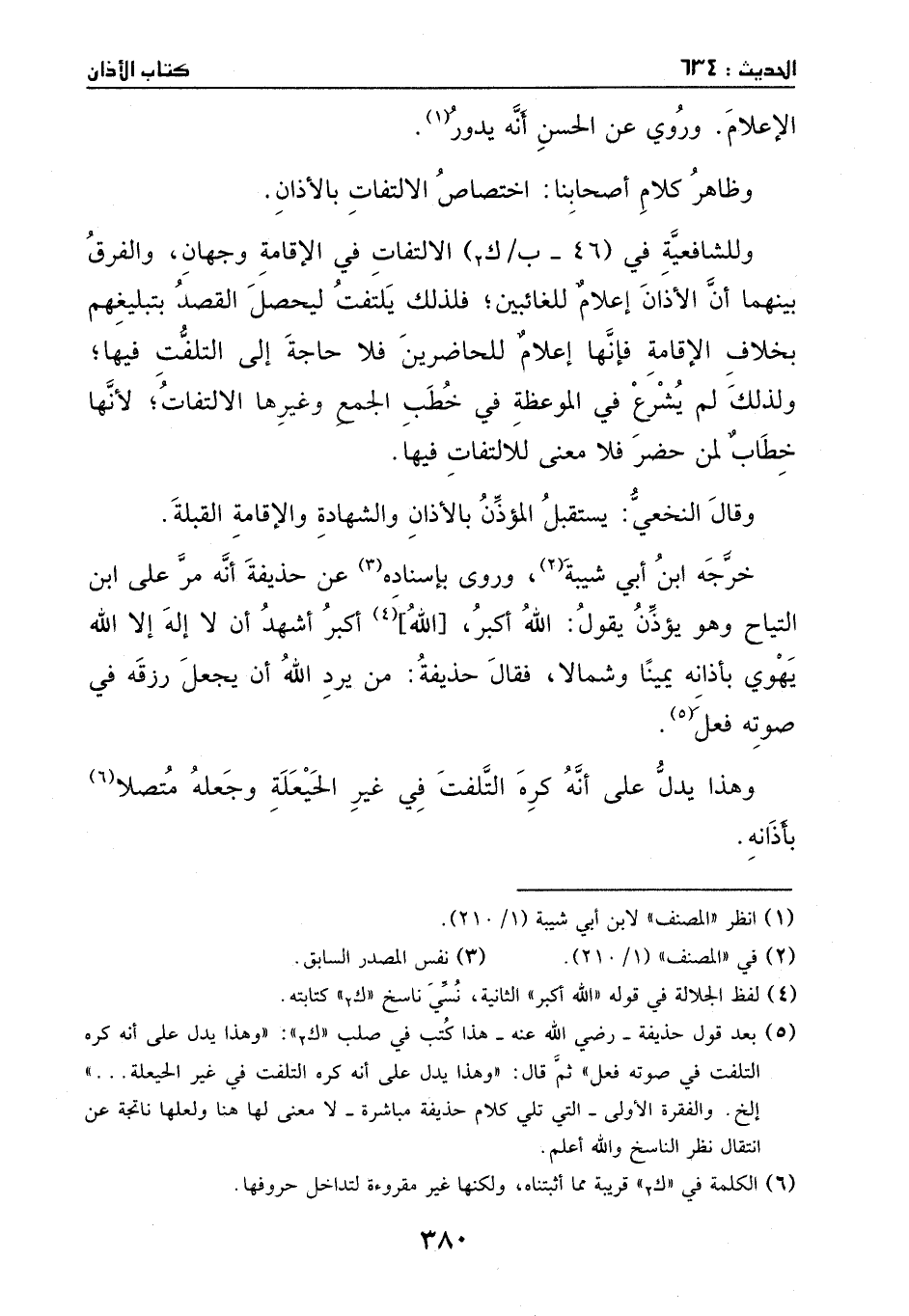 وهذا يدل على انه كره التلفت في غير الحيعلة، وجعله مناكلاً بأذانه.