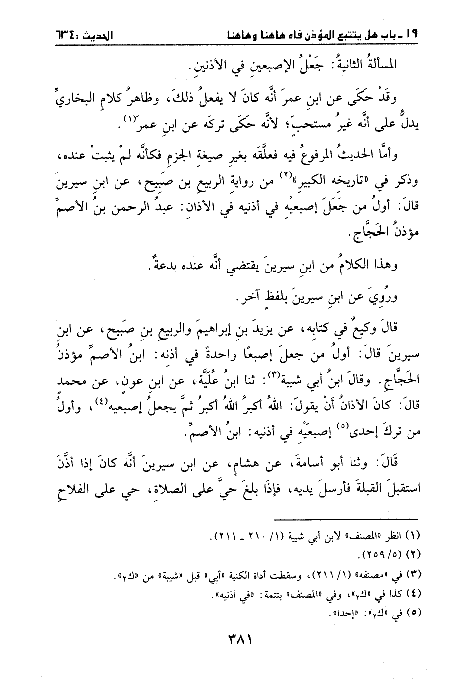 وقال ابن أبي شيبة: ثنا ابن علية، عن ابن عون، عن محمد، قال: كان الأذان أن يقول: الله أكبر، الله أكبر، ثم يجعل اصبعيه، واول من ترك إحدى أصبعيه في أذنيه ابن الاصم.